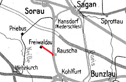 Rauscha 0,0 km 210,45 der Strecke Berlin Schlesischer Bf 0,10 - Frankfurt (Oder) Pbf 81,20 - Sommerfeld 156,83 - Gassen 162,43 - Kohlfurt 224,22 - Lauban 245,97 - Hirschberg (Riesengeb) Hbf 297,92 - Waldenburg-Dittersbach 344,83 - Glatz Hbf 395,83