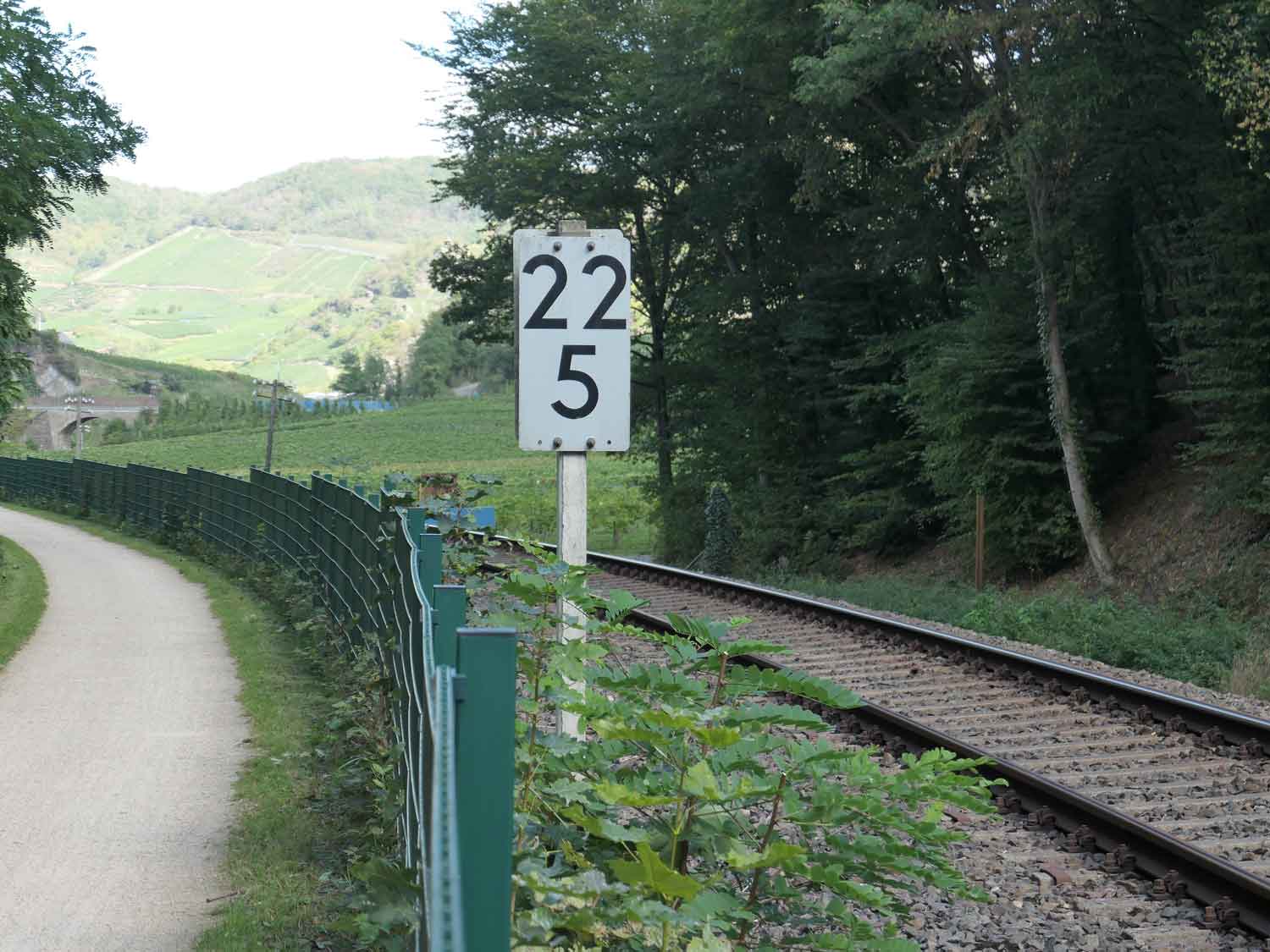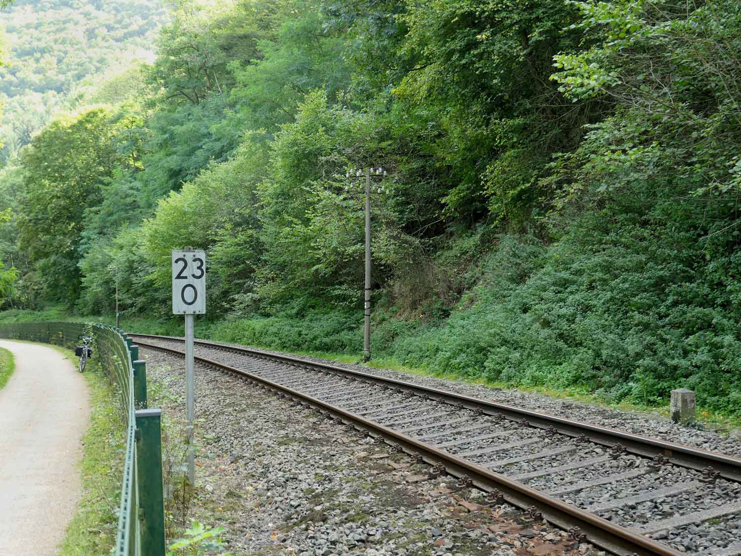 km 28,5 (Tafel) und km 28,6 (Stein) zwischen Kreuzberg und Ahrbrück - Blick Richtung Remagen