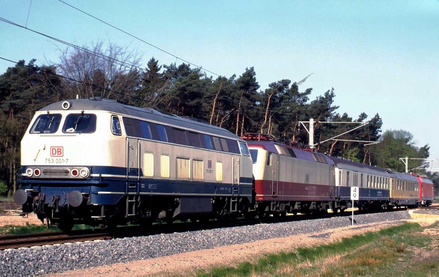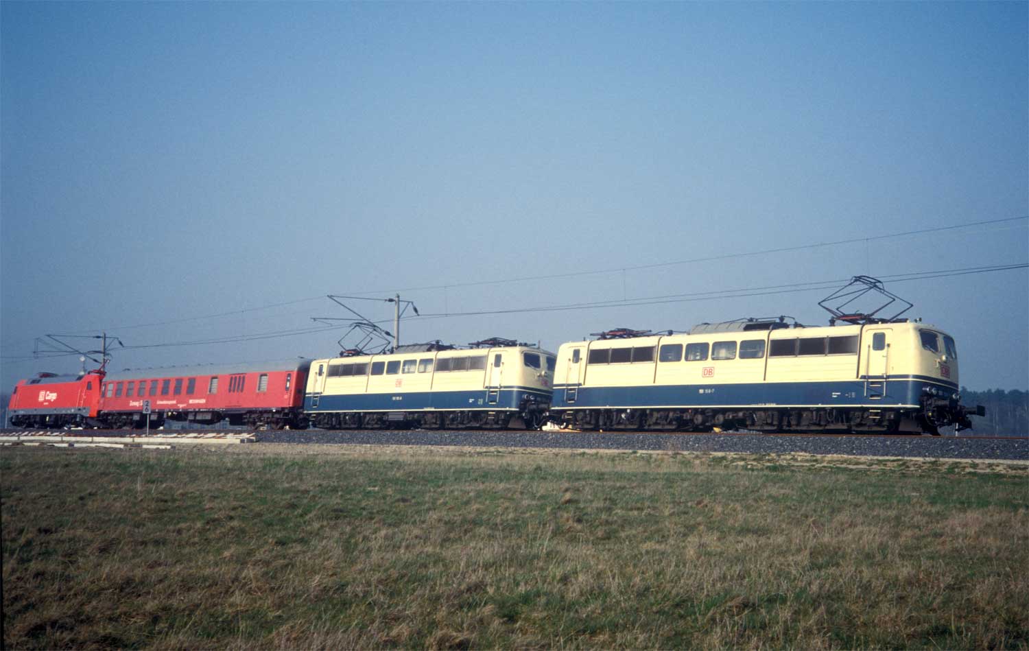Messzug: vorne 152 001, dann der Messwagen 50 80 09-40 056-7P (ein BDm 028), gefolgt von den beiden Bremsloks 151 151 und 151 156.