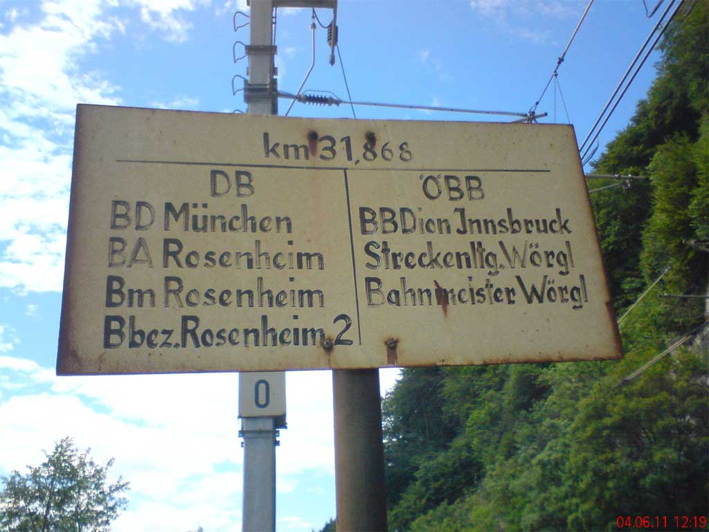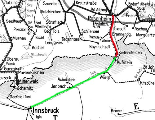 Rosenheim 0,0 - Kiefersfelden 30,50 - Staatsgrenze Deutschland/Österreich 31,868 = (km 0,0 - Kufstein 2,339 - Wörgl Hbf 16,027 - Jenbach 40,882 - Innsbruck Hbf 75,130)