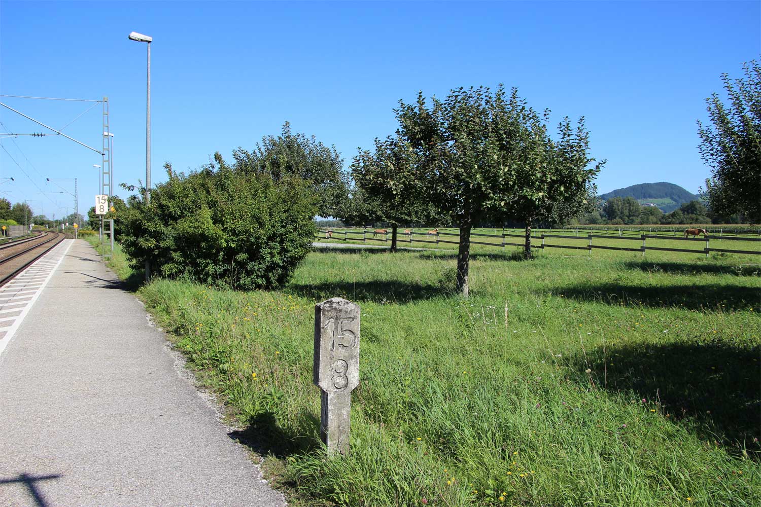 km 14,7 (Stein) und km 14,8 (Tafel) zwischen Brannenburg und Flintsbach - Blick Richtung Kiefersfelden - Innsbruck