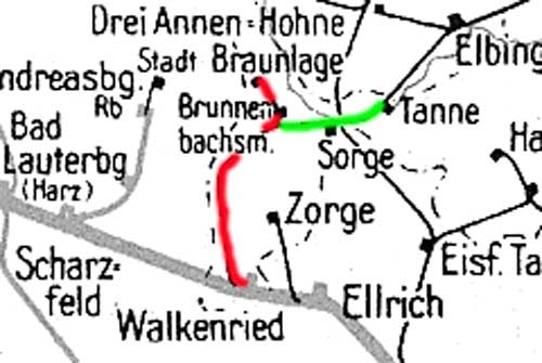 Sorge SHE | 5,11 | km 34,15 der Strecke Nordhausen Nord 0,0 - Eisfelder Talmühle 17,29 - Drei Annen Hohne 46,44 - Wernigerode 60,48 mit Verbindungsgleis zur SHE |