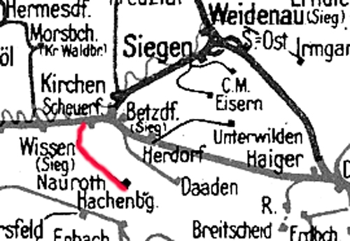 Scheuerfeld WEBA 0,0 Verbindungsgleis zur Strecke Köln-Deutz 0,0 - Troisdorf 20,06 - Au (Sieg) 64,76 - Betzdorf (Sieg) 82,97 - Haiger 118,83 - Dillenburg 125,00 - Wetzlar 153,40 - Gießen 166,00