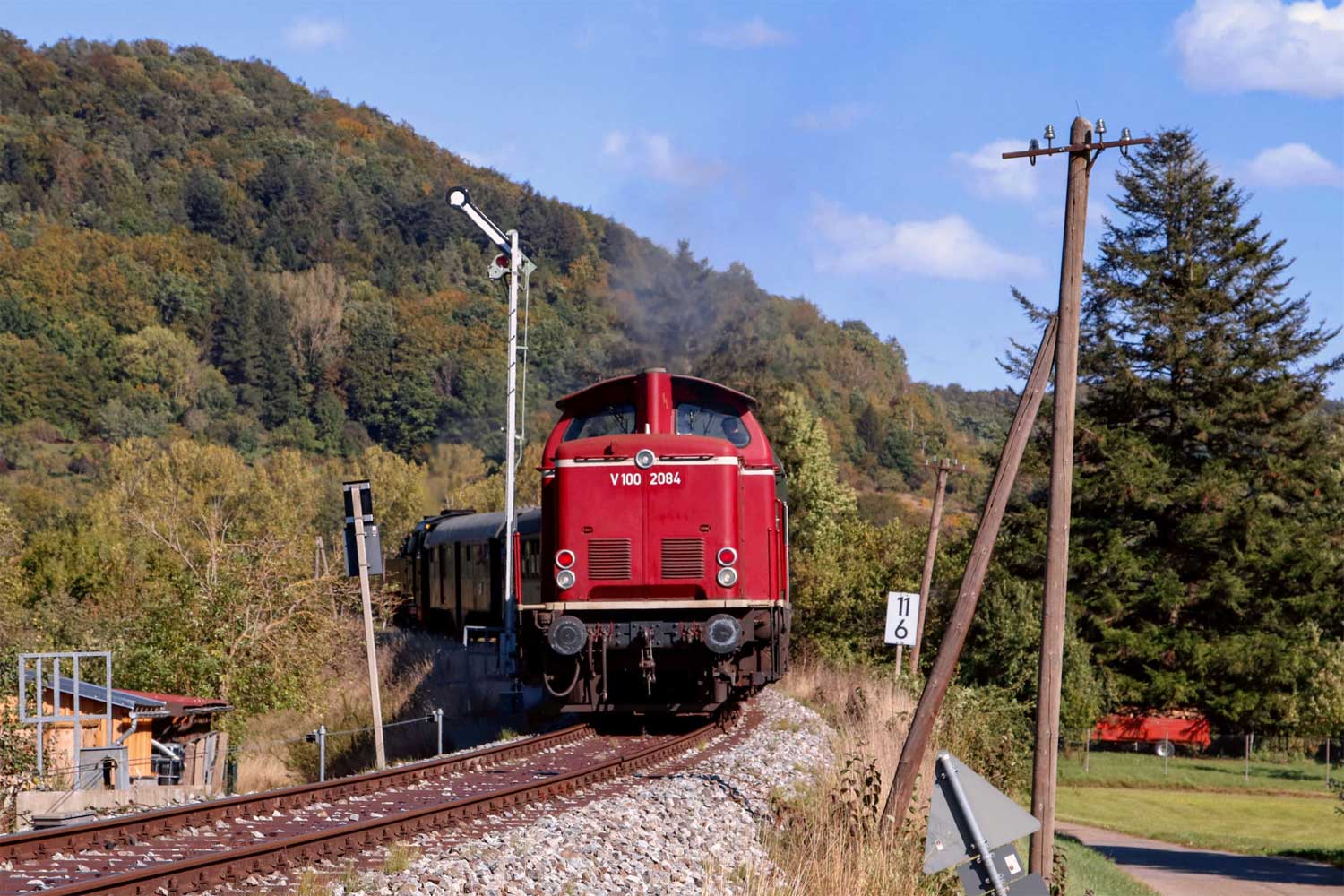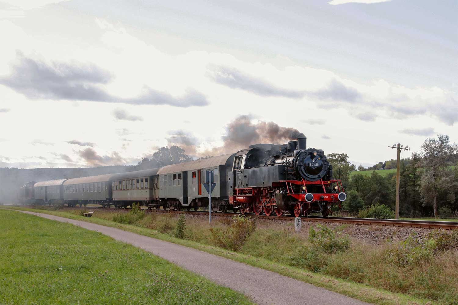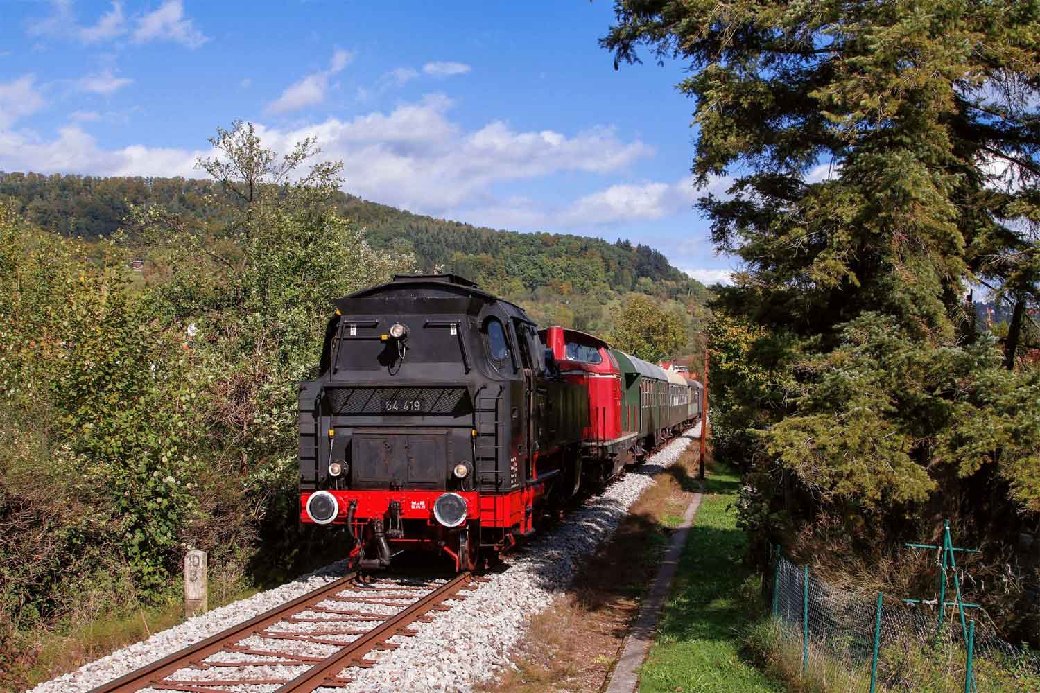 An der Spitze des Zuges 64 419 und V100 2084 als Schlusslok