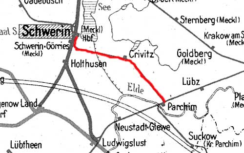Parchim | 45,33 | km 25,90 der Strecke Ludwigslust 0,0 - Parchim 25,9 - Karow (Meckl) 61,00 - Waren (Müritz) 95,79 - Möllenhagen 116,2 - Streckenunterbrechung - [Neubrandenburg 142,36] |