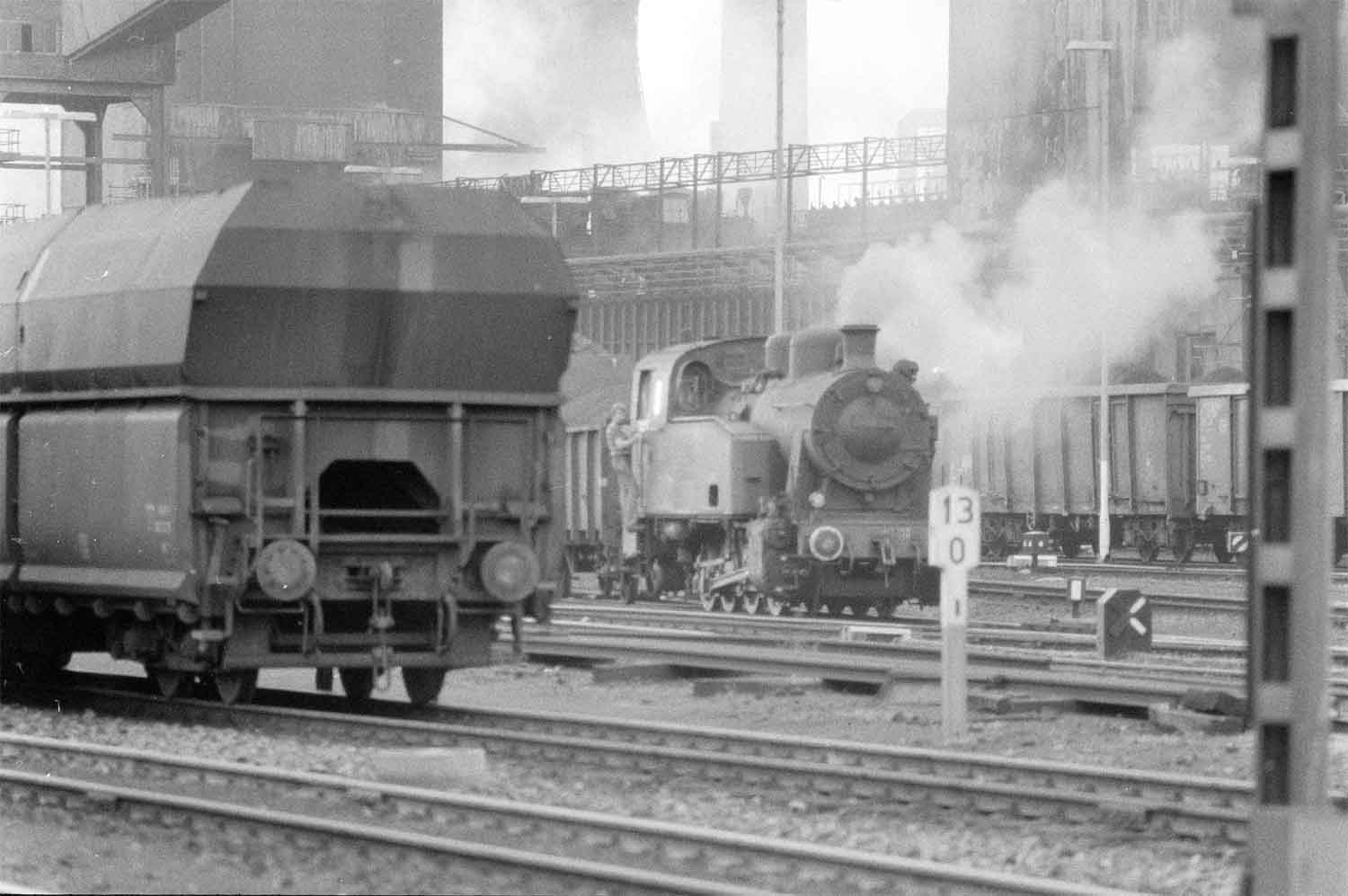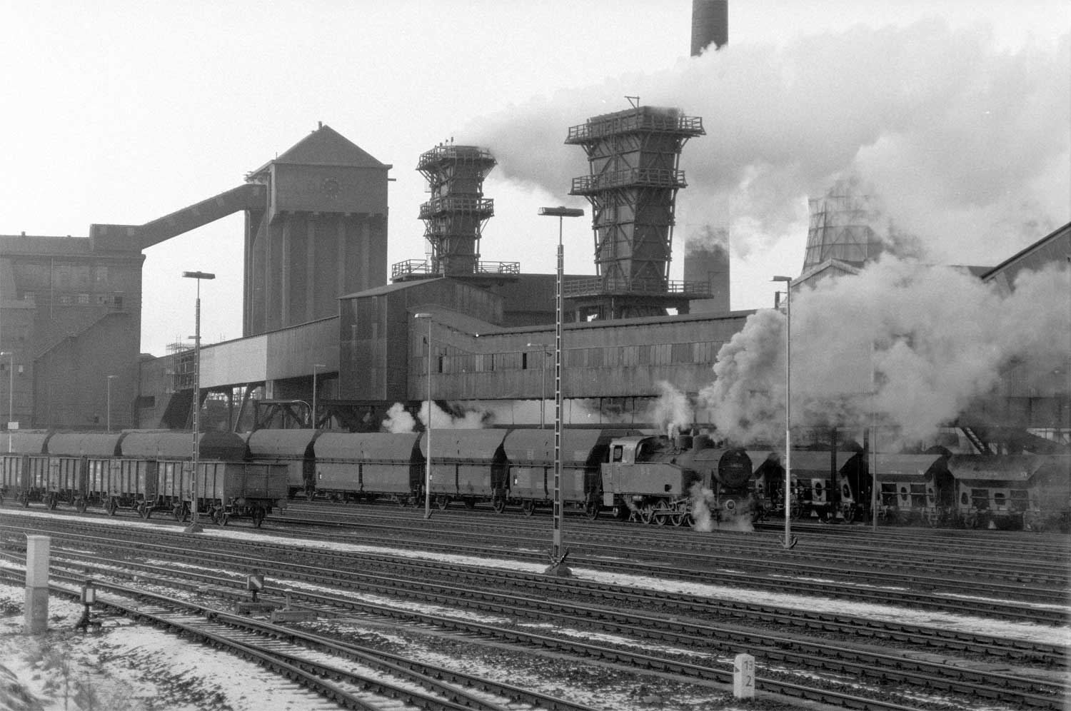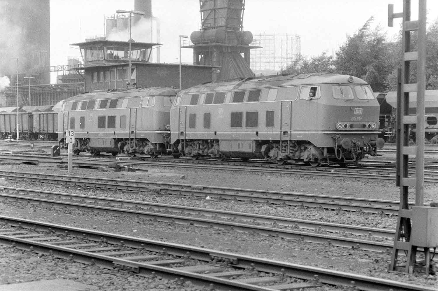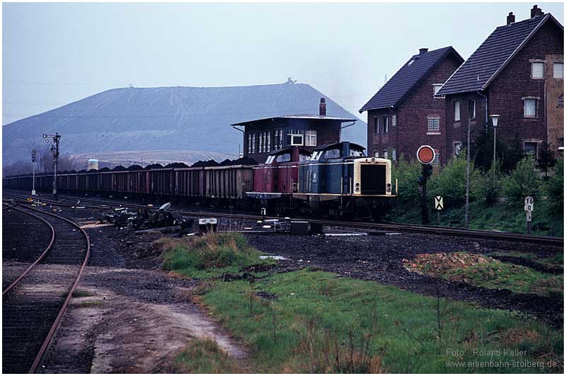 Am 30. April 1984 röhrten 212 105 und 212 069 (rot) mit einem Kohlezug aus Siersdorf durch den schon von Rückbaumaßnahmen der Bundesbahn gezeichneten Merksteiner Güterbahnhof, der gelegentlich nach einer anderen, bereits vergangenen Grube auch „Bahnhof Nordstern“ genannt wurde.