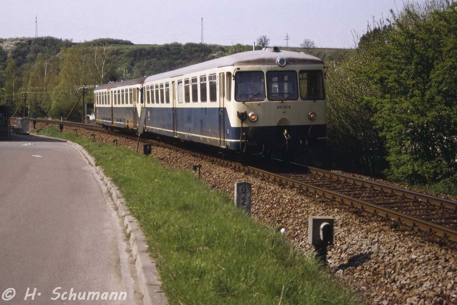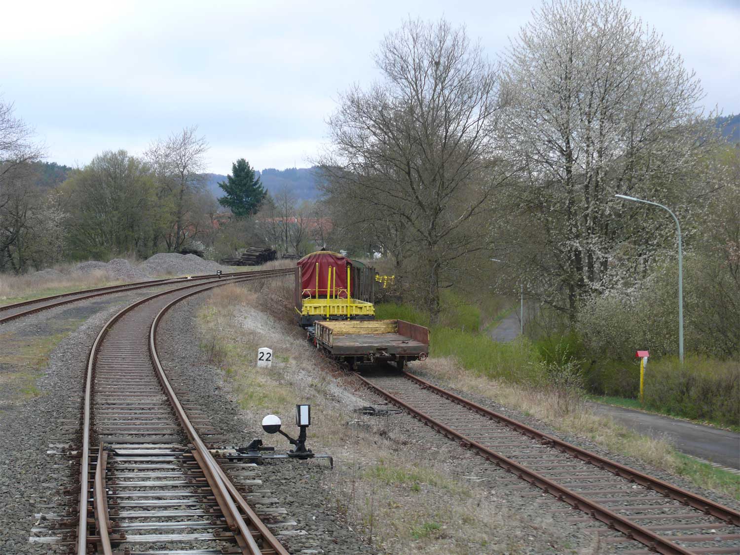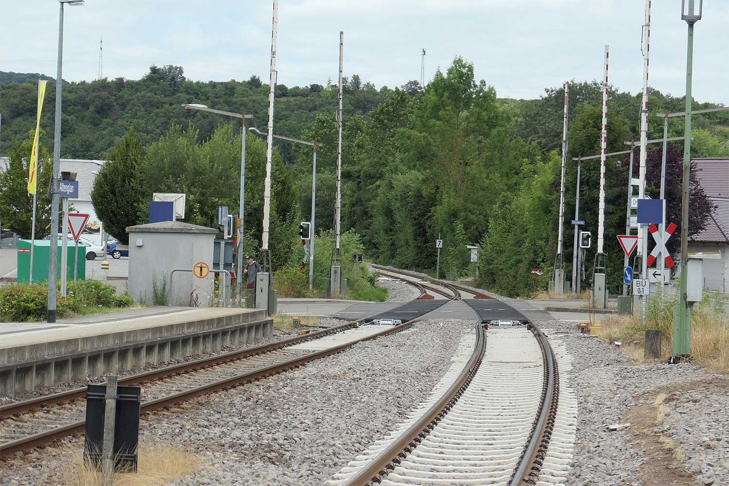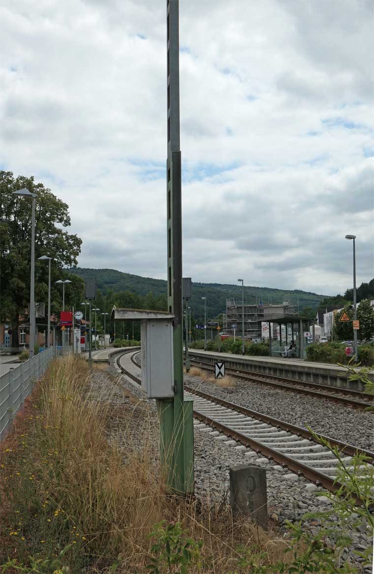 km 0,2 (links neben der Lok) und km 0,3 (im Hintergrund) in Altenglan - Blick Richtung Kusel