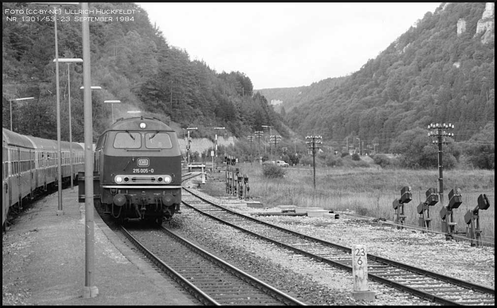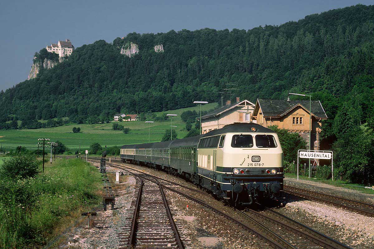 km 23,6 in Hausen im Tal - 215 005 mit E 3360 (Ulm - Donaueschingen/Villingen) kreuzt den E 3363 (Freiburg - Ulm)