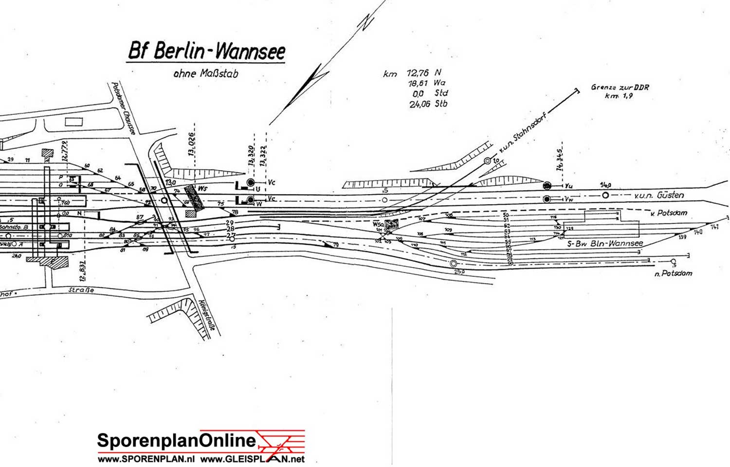 Berlin-Wannsee | 0,0 | km 12,76 der Strecke Berlin-Charlottenburg 0,0 (später: -0,12) - Wiesenburg 77,83 - Güsten 147,34 - Blankenheim Trennungsbf 188,06 |