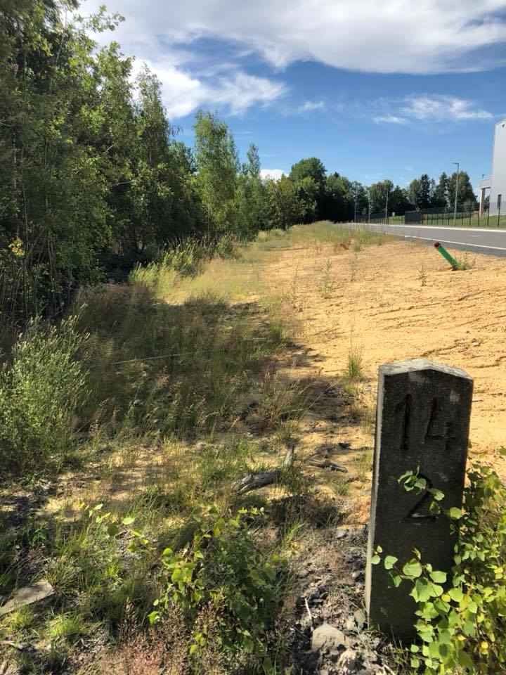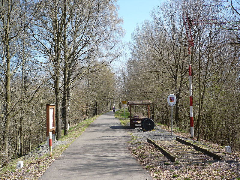 English: Trackbed of the closed railway line (now a cycleway) between Cheb (Czech Republic) and Wiesau (Germany) at the border crossing-point. The white stones inscribed "D" on either side of the route mark the line of the border.