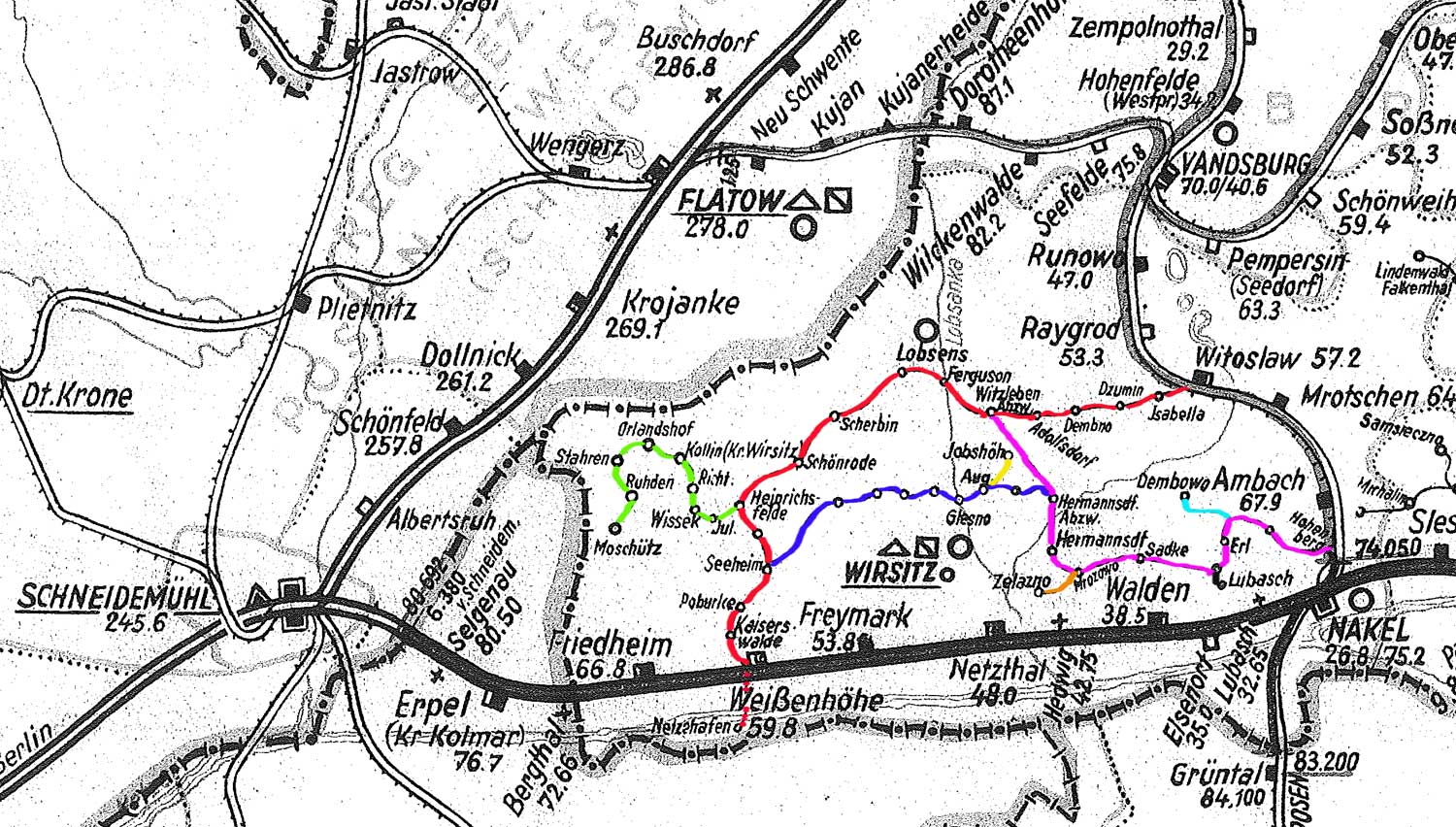 Weissenhöhe Kreisbahnhof 0,0 - Seeheim Fabrik 11,9 - Heinrichsfelde 16,9 - Witzleben Abzweigung 36,4 - Witoslaw Kreisbahnhof (Veitshof Kreisbahnhof) 47,7