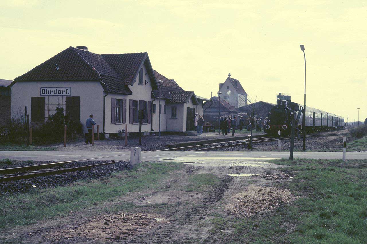 Pendelzug in Ohrdorf, fast in Sichtweite der innerdeutschen Grenze. Der Zug war mit der "Graf Bismarck VI" und der 16 "Schunter" bespannt, dazwischen Wagen von der DB und vom Verein Braunschweiger Verkehrsfreunde.
