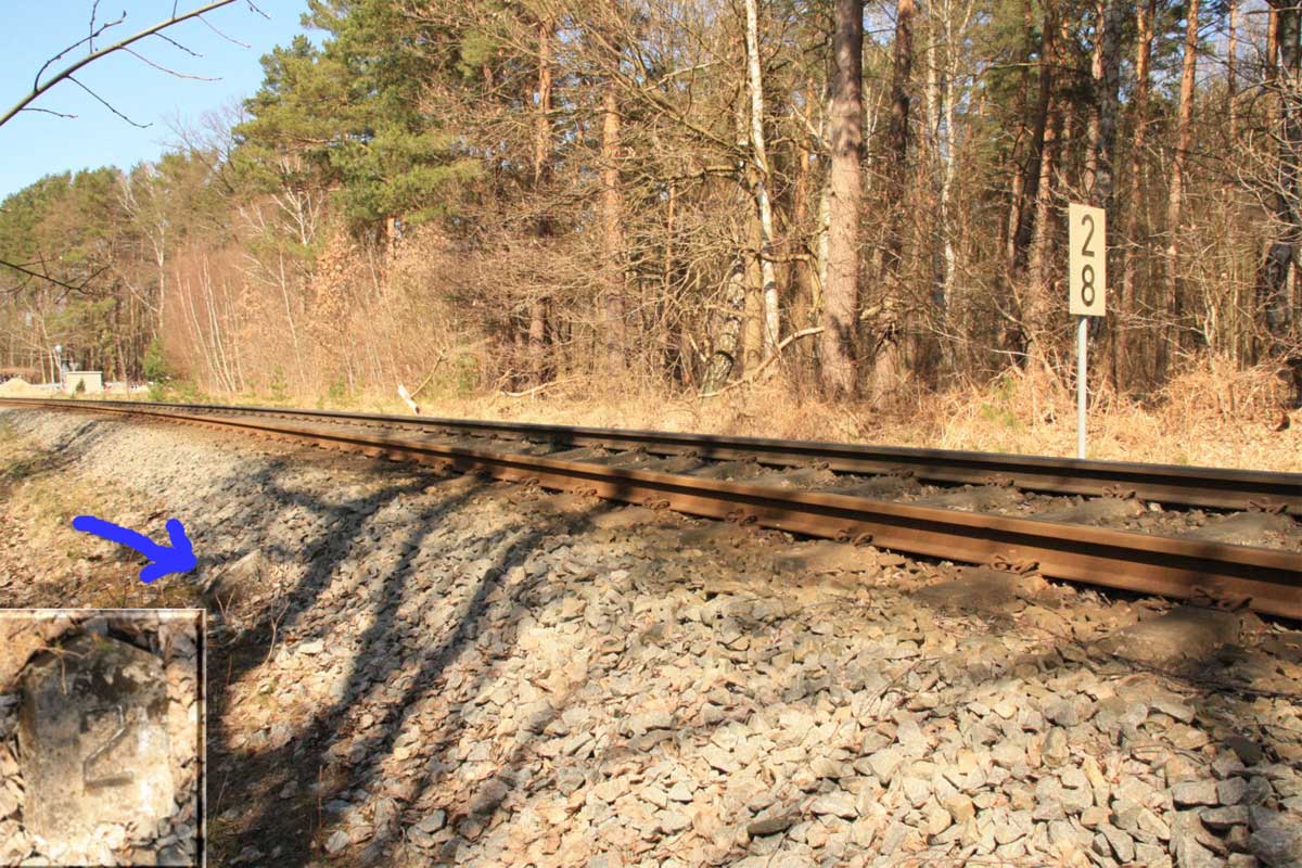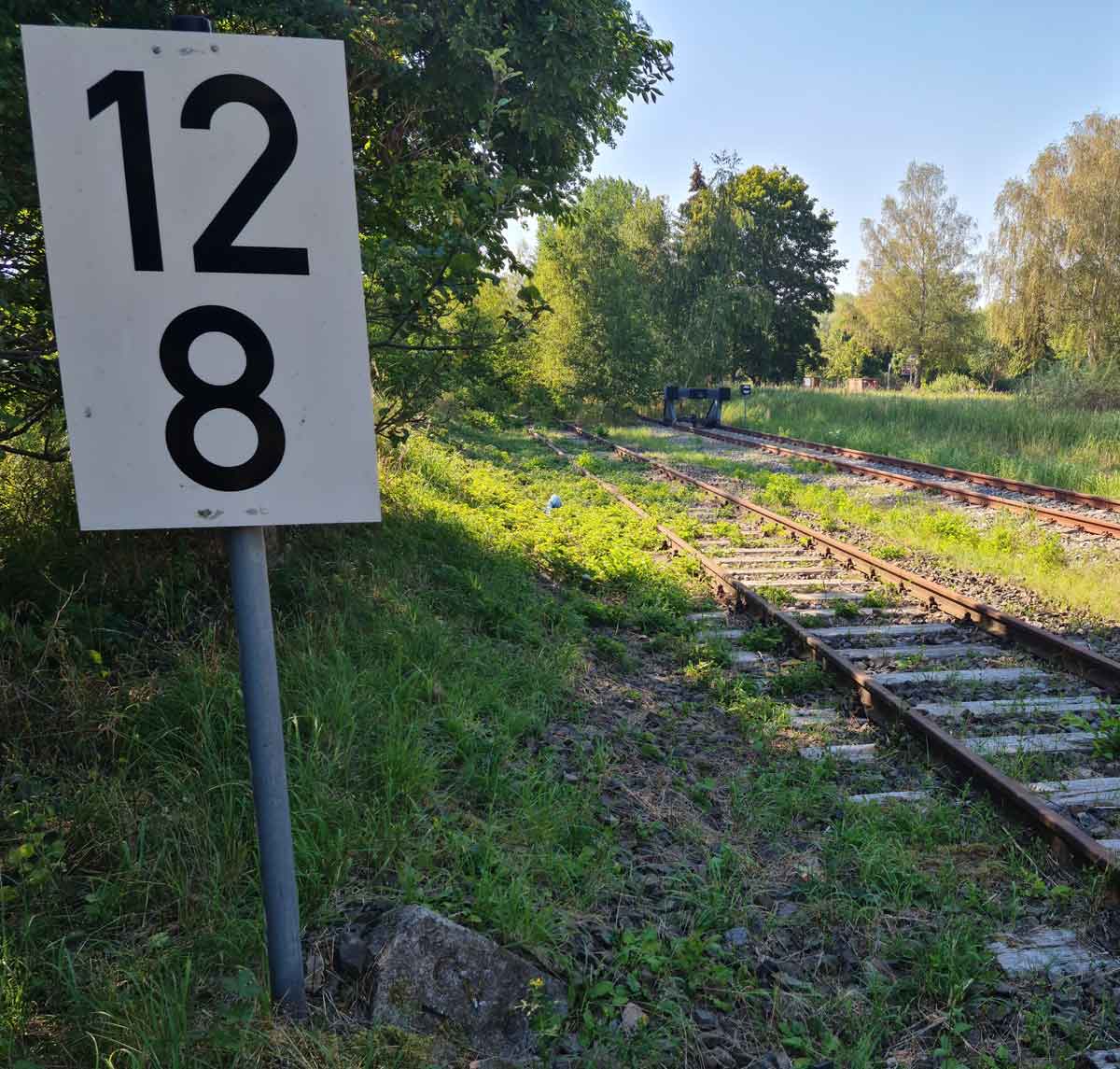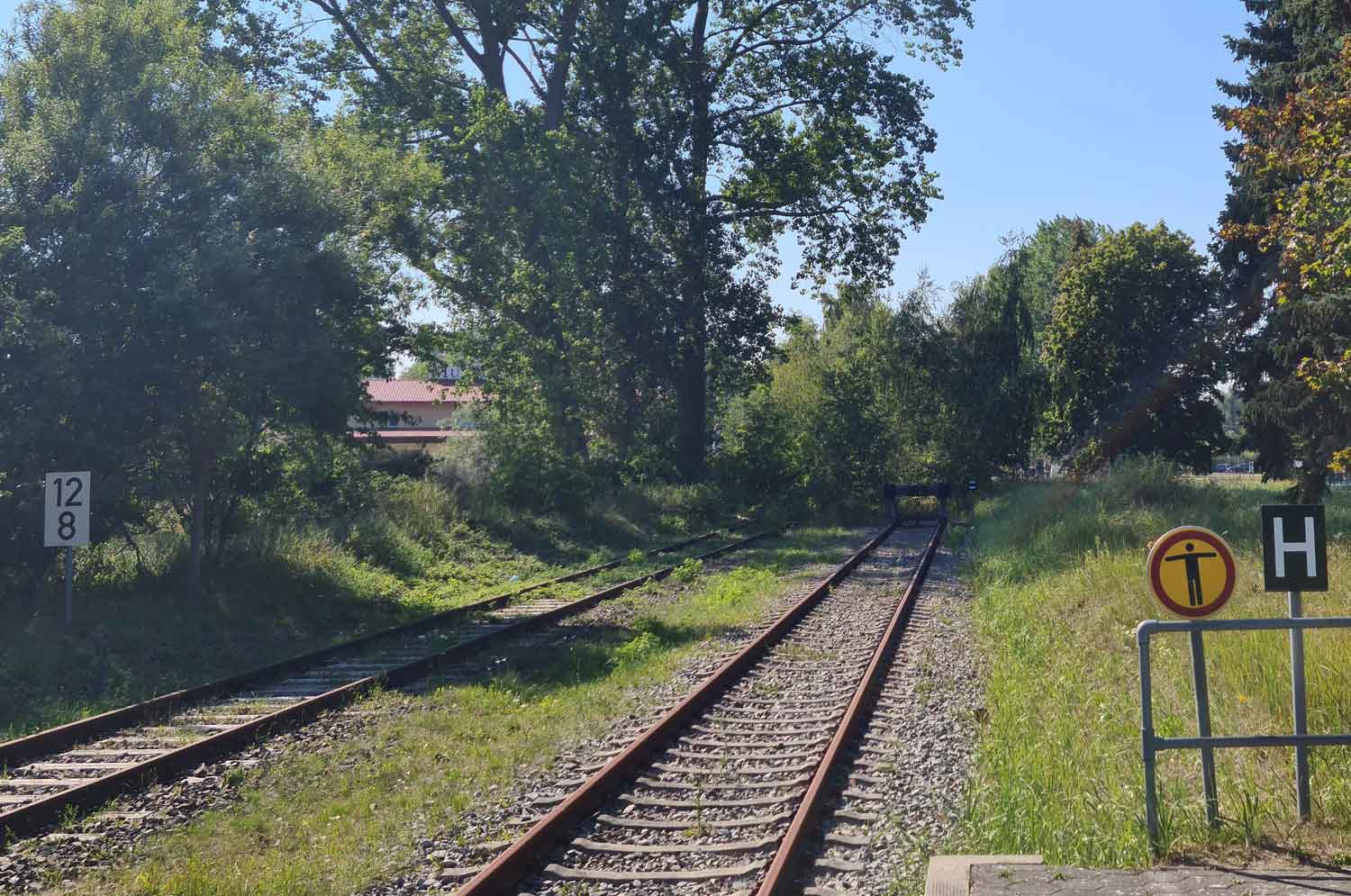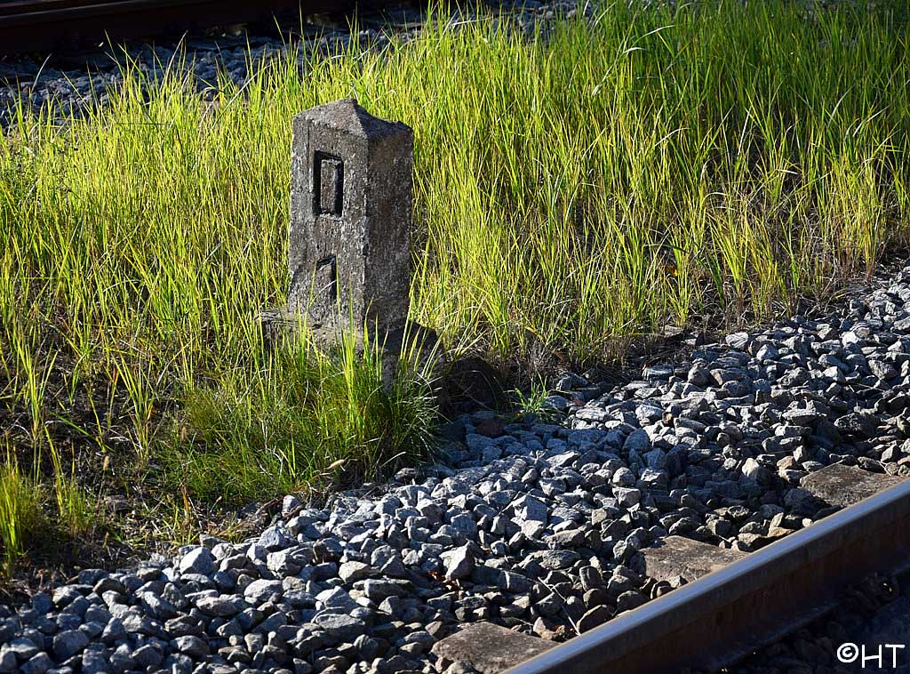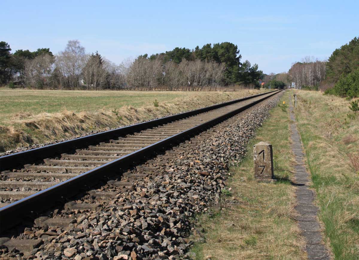 km 0,6 (Tafel links und wahrscheinlich Stein zwischen den Gleisen) in Zinnowitz