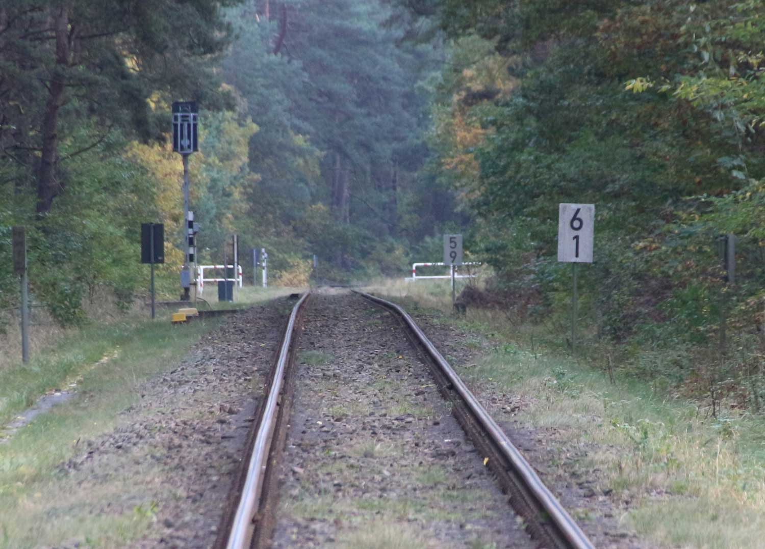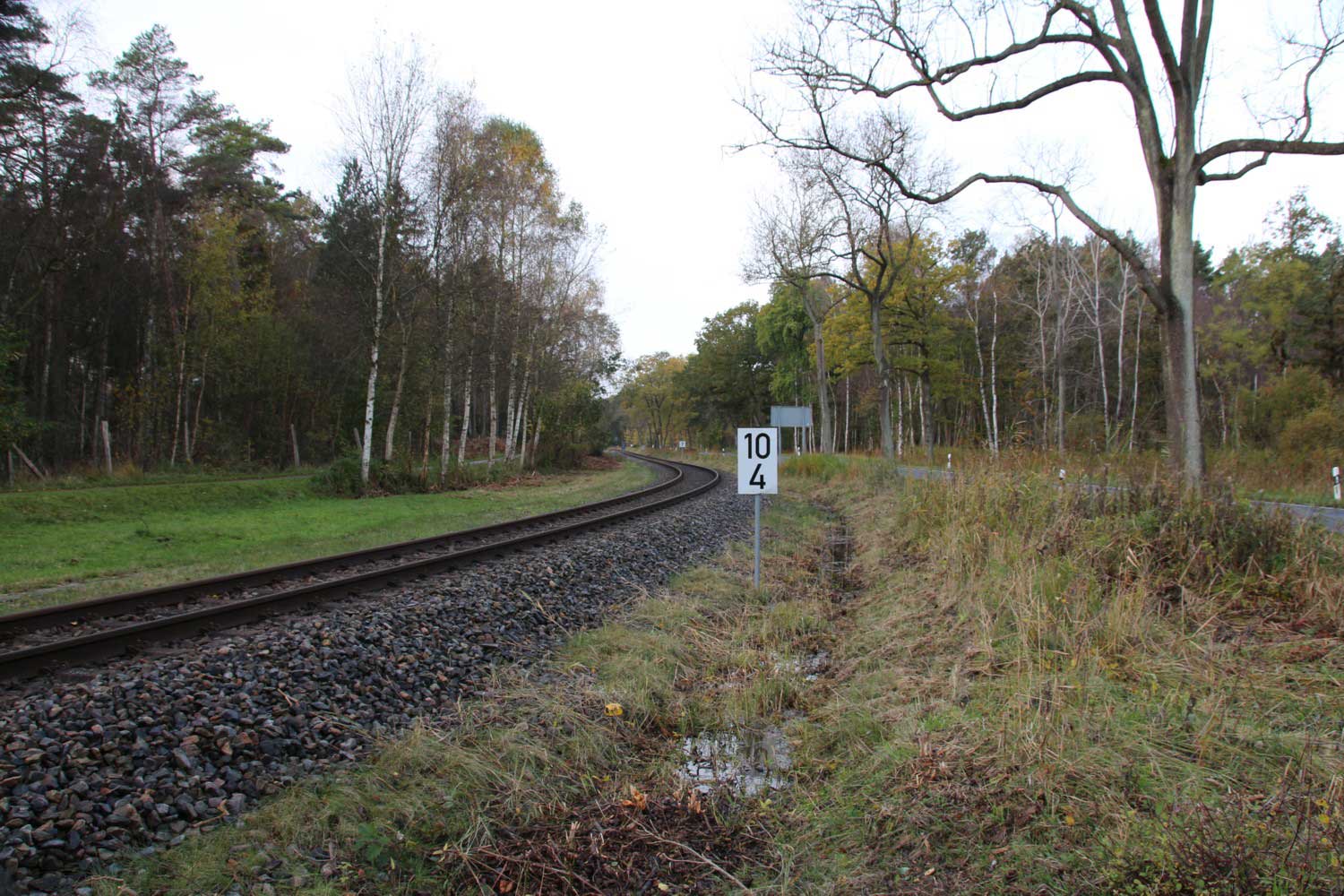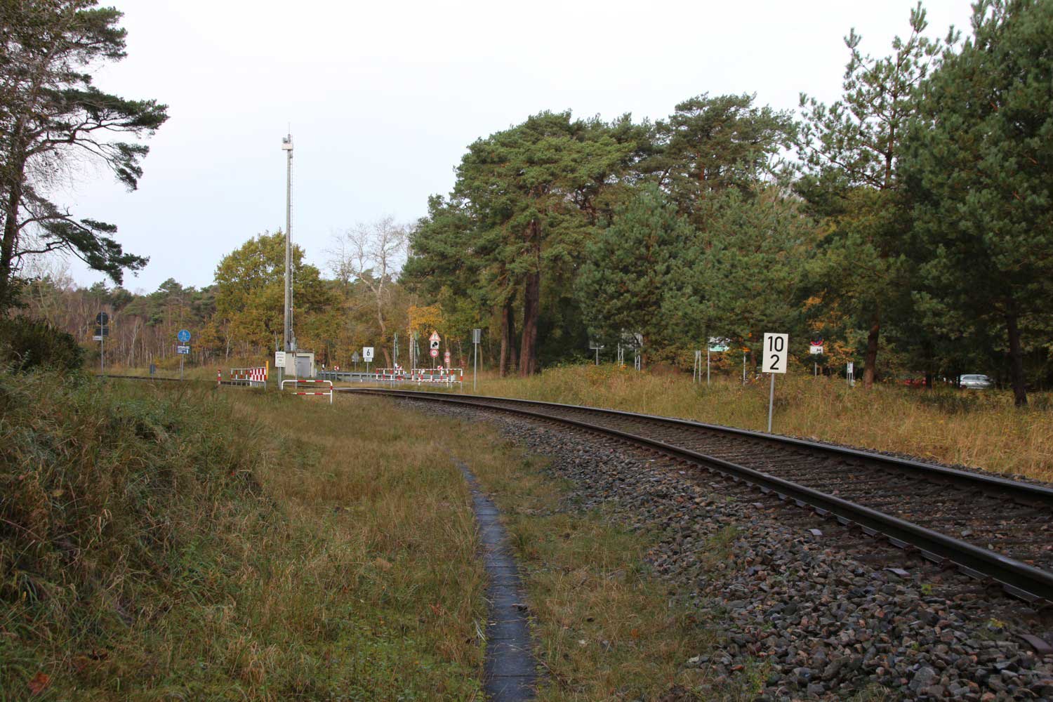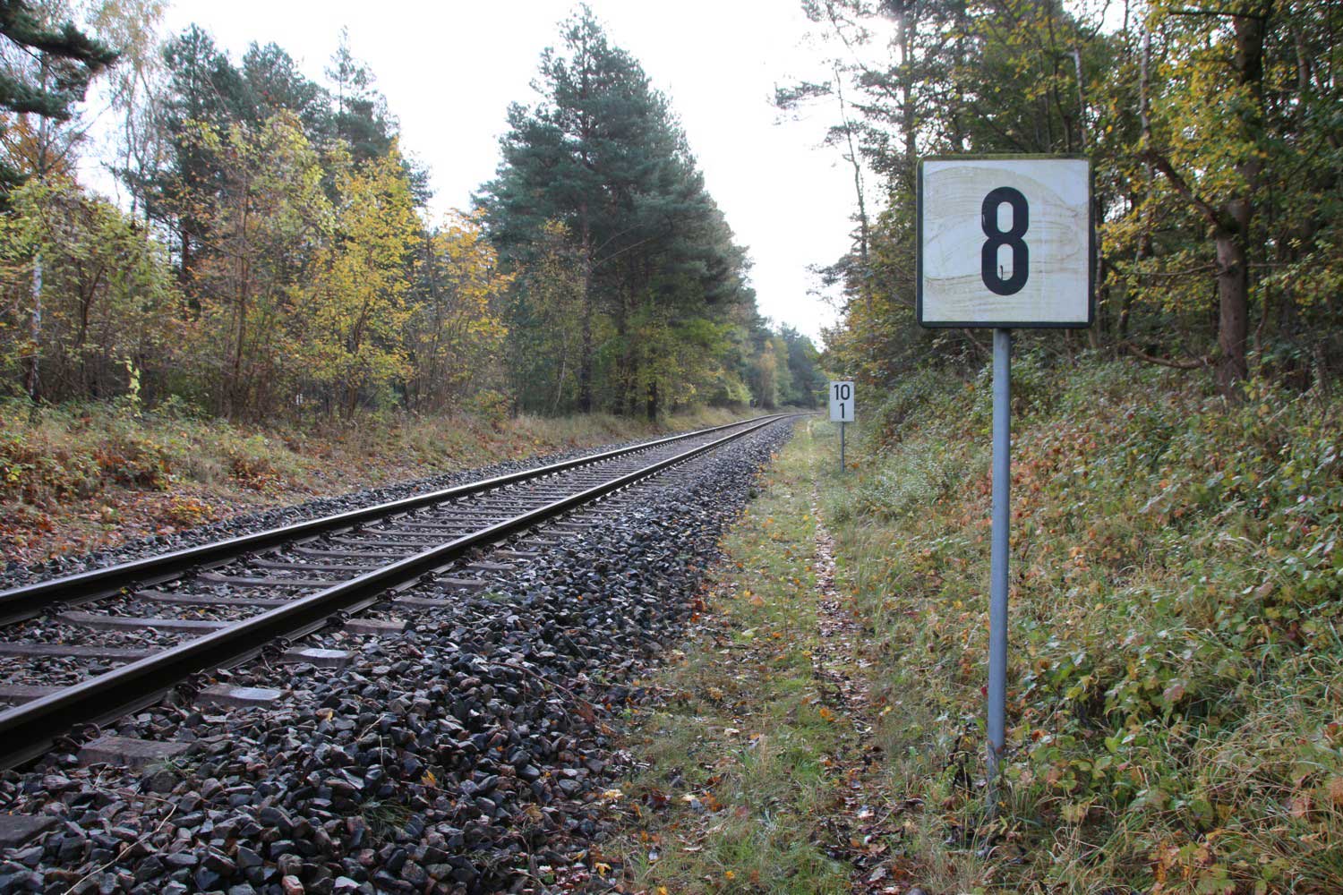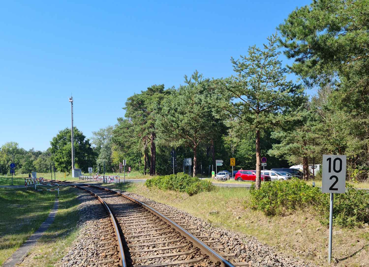 km 0,6 (Tafel links und wahrscheinlich Stein zwischen den Gleisen) in Zinnowitz