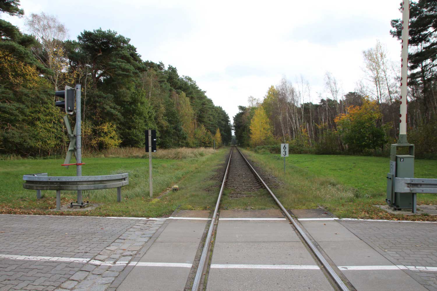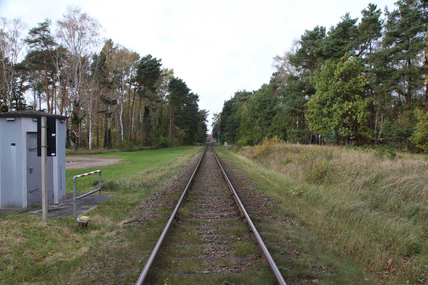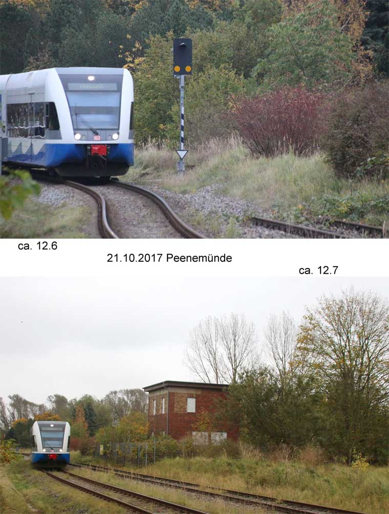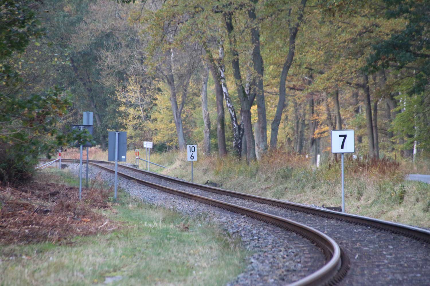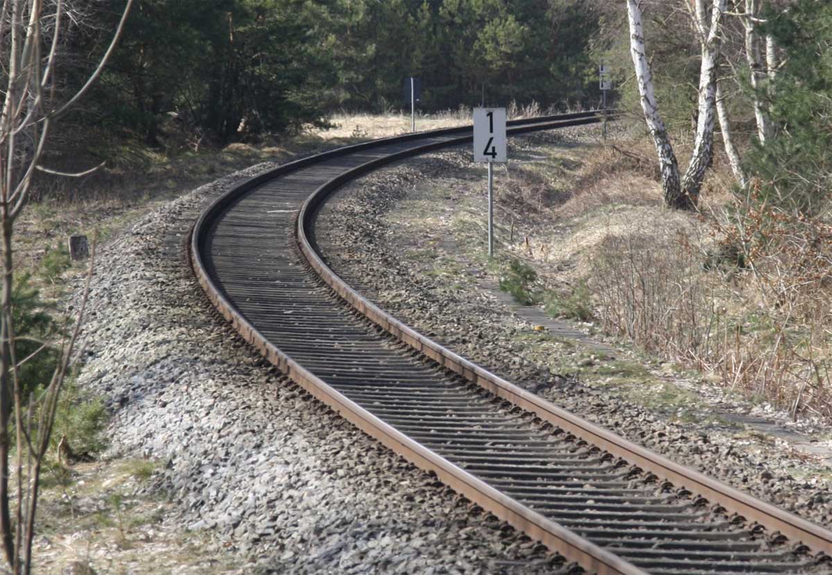 km 0,6 (Tafel links und wahrscheinlich Stein zwischen den Gleisen) in Zinnowitz