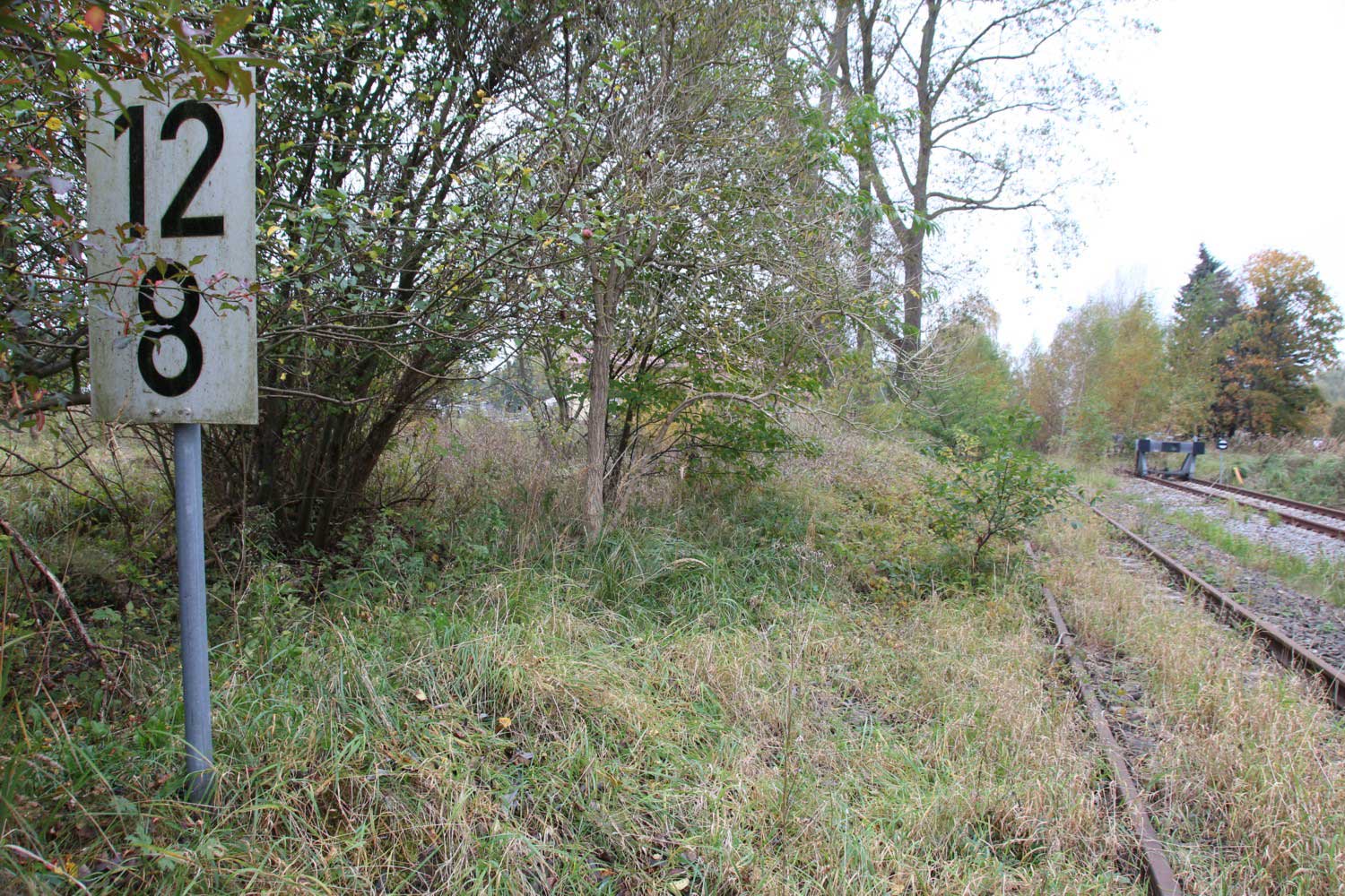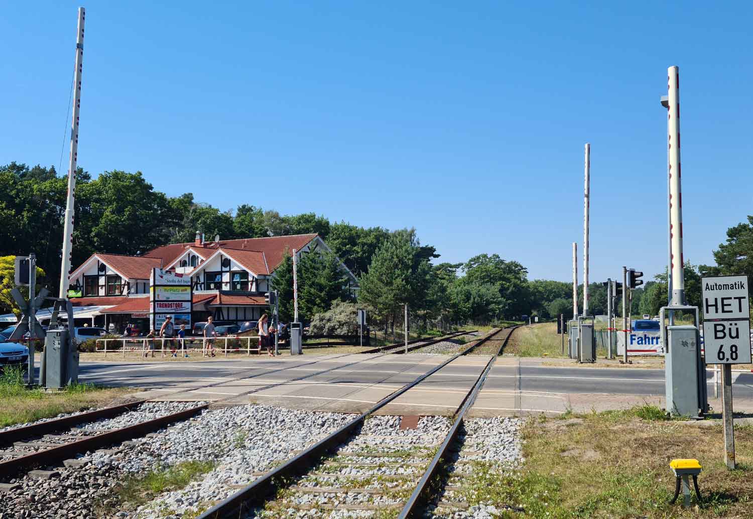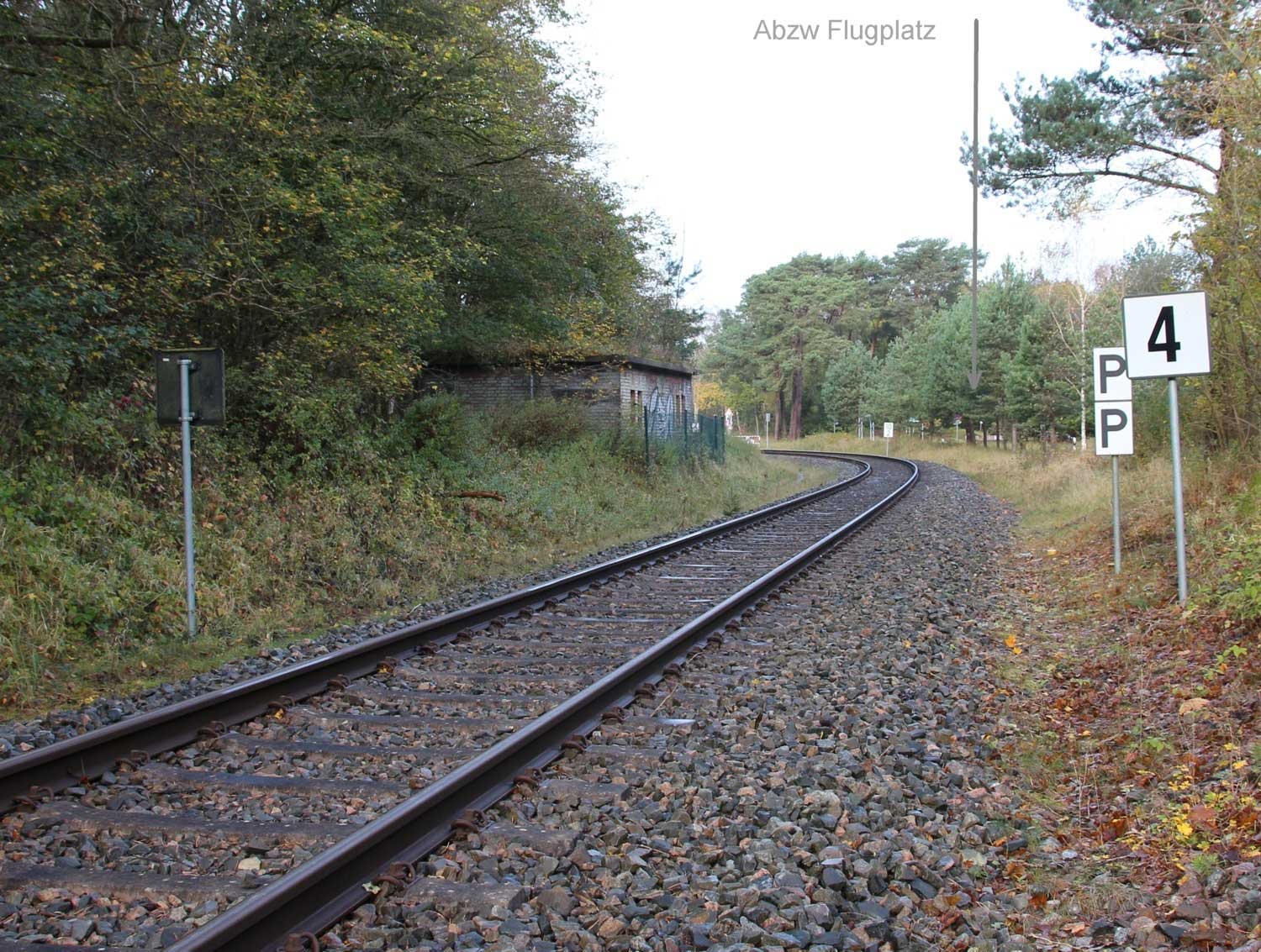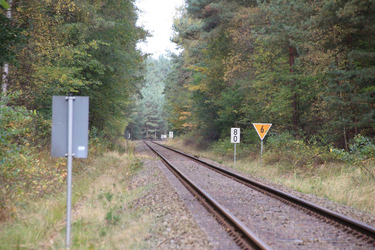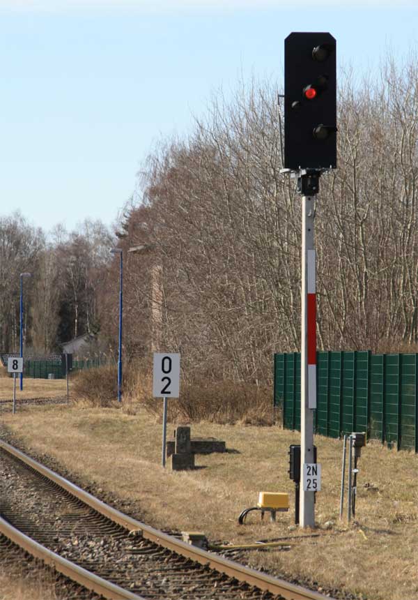 km 0,6 (Tafel links und wahrscheinlich Stein zwischen den Gleisen) in Zinnowitz