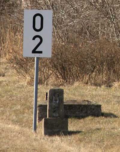 km 0,2 (Tafel und Stein) und km 235,2 in Zinnowitz
