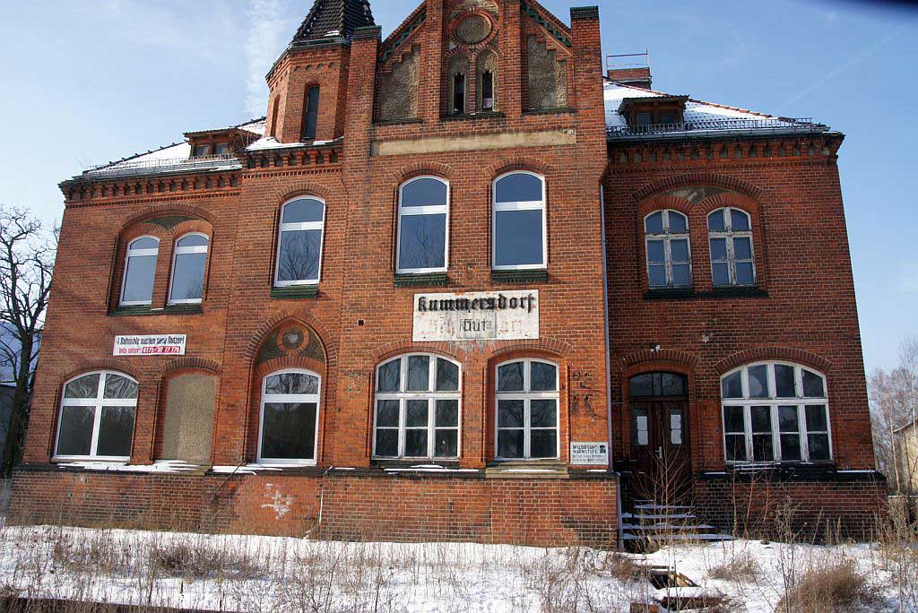Bahnhofsgebäude in Kummersdorf Gut, beim genaueren Hinsehen kann man noch "Schießplatz" sehen.