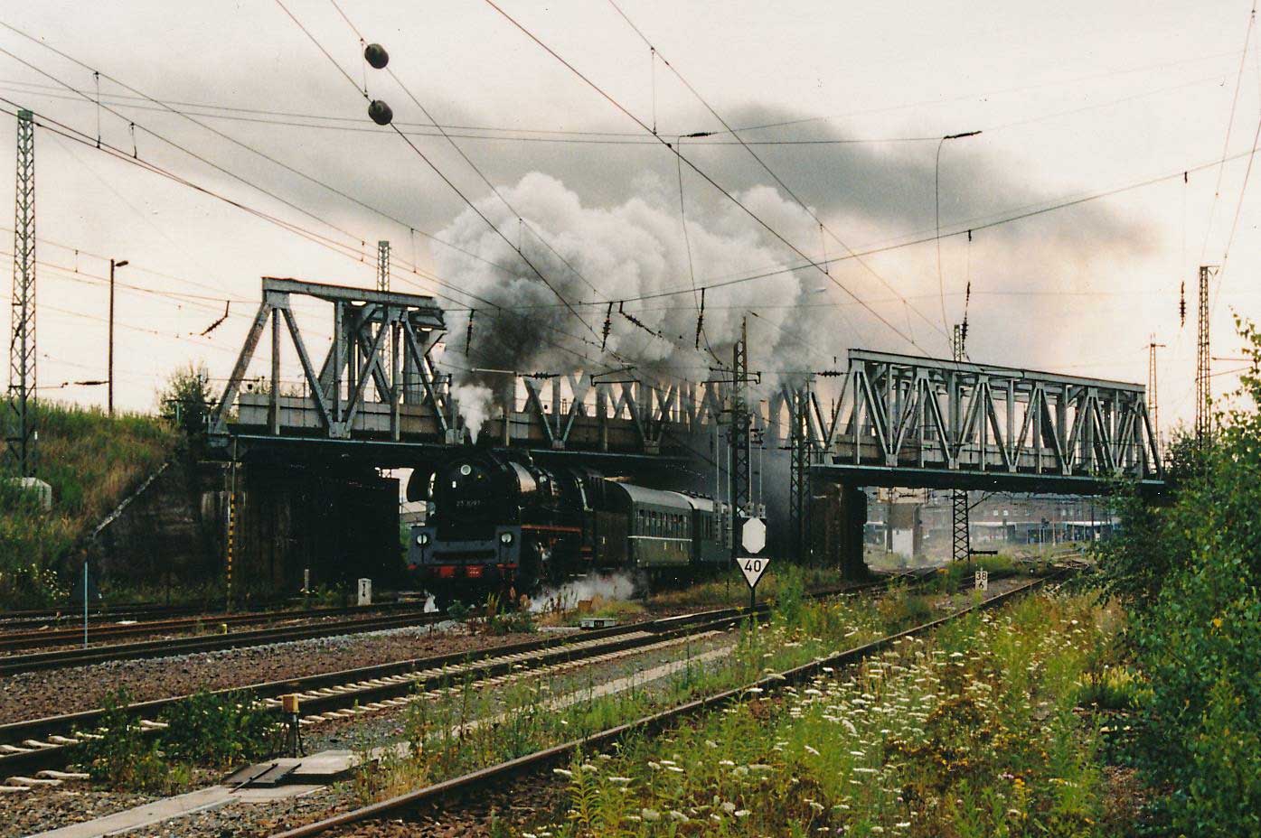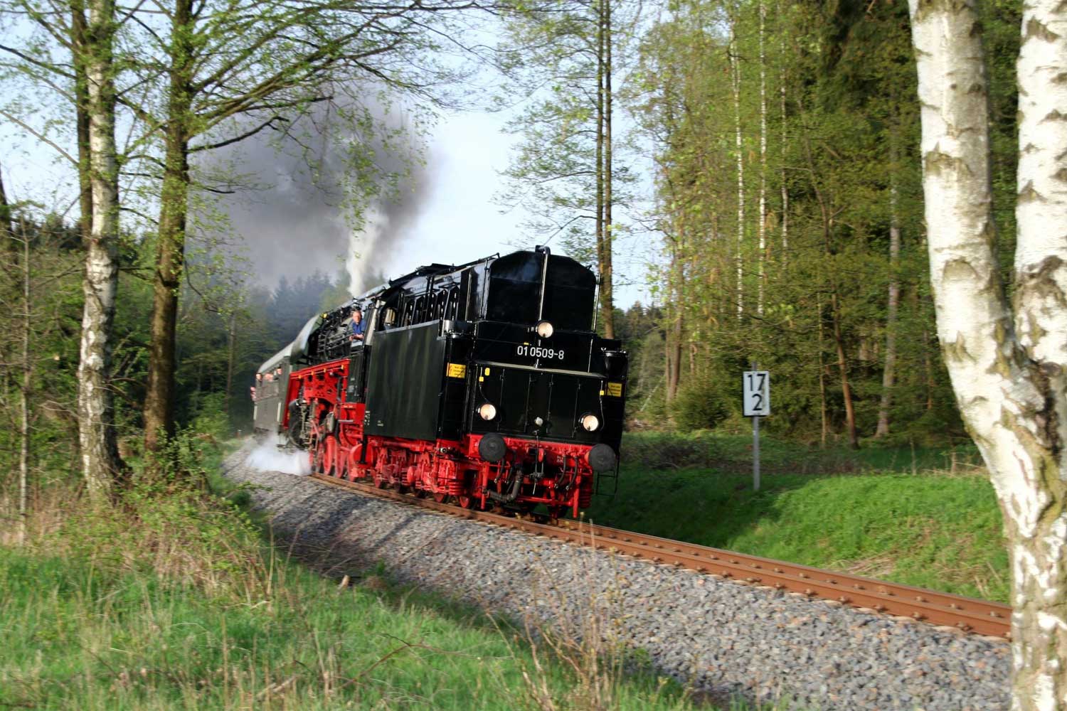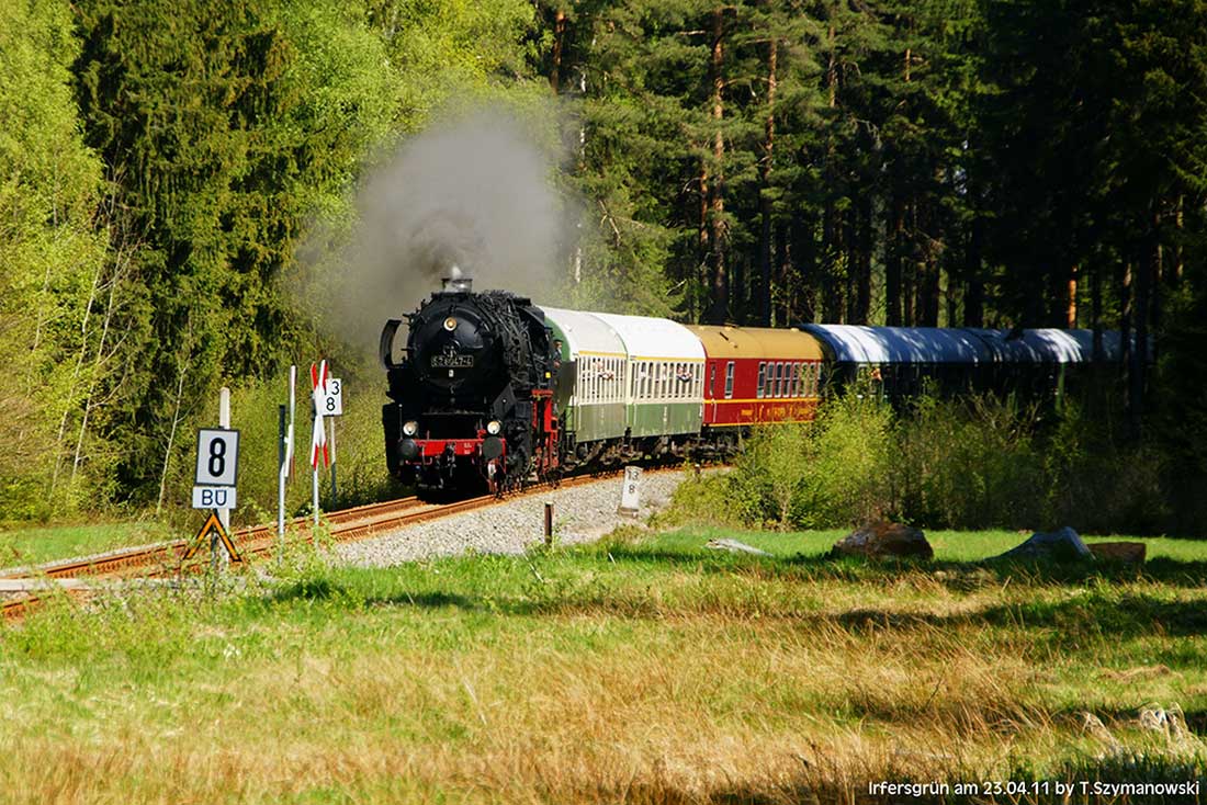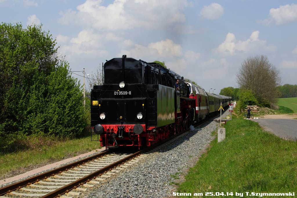 01 0509 bringt einen Charterzug von Zwickau (Sachs) Hbf nach Neuenmarkt-Wirsberg.