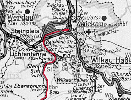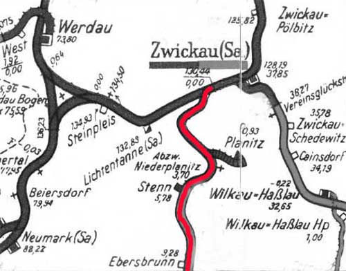 Bei Inbetriebnahme der Strecke Zwickau (Sa) - Falkenstein (Vogtl) 1875 endete die Strecke im Falkensteiner Bf [südlich des Bf Zwickau (Sa)].