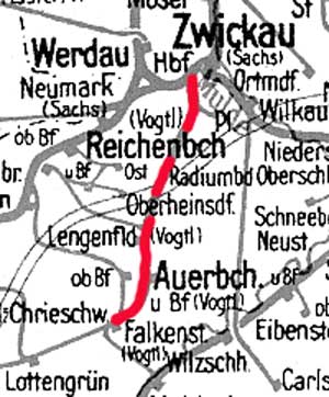 1936 wurde mit dem Bau des Rangierbf Zwickau (Sa) die Strecke nach Falkenstein separat und kreuzungsfrei in den Bf Zwickau (Sa) eingeführt.