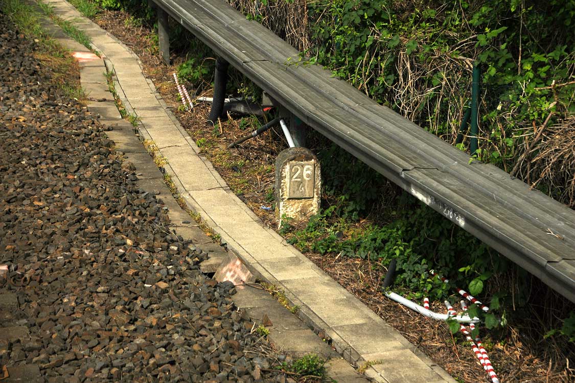 Im Hintergrund ist an dem zweiten Schaltschrank die Kilometertafel km 7,6 zu