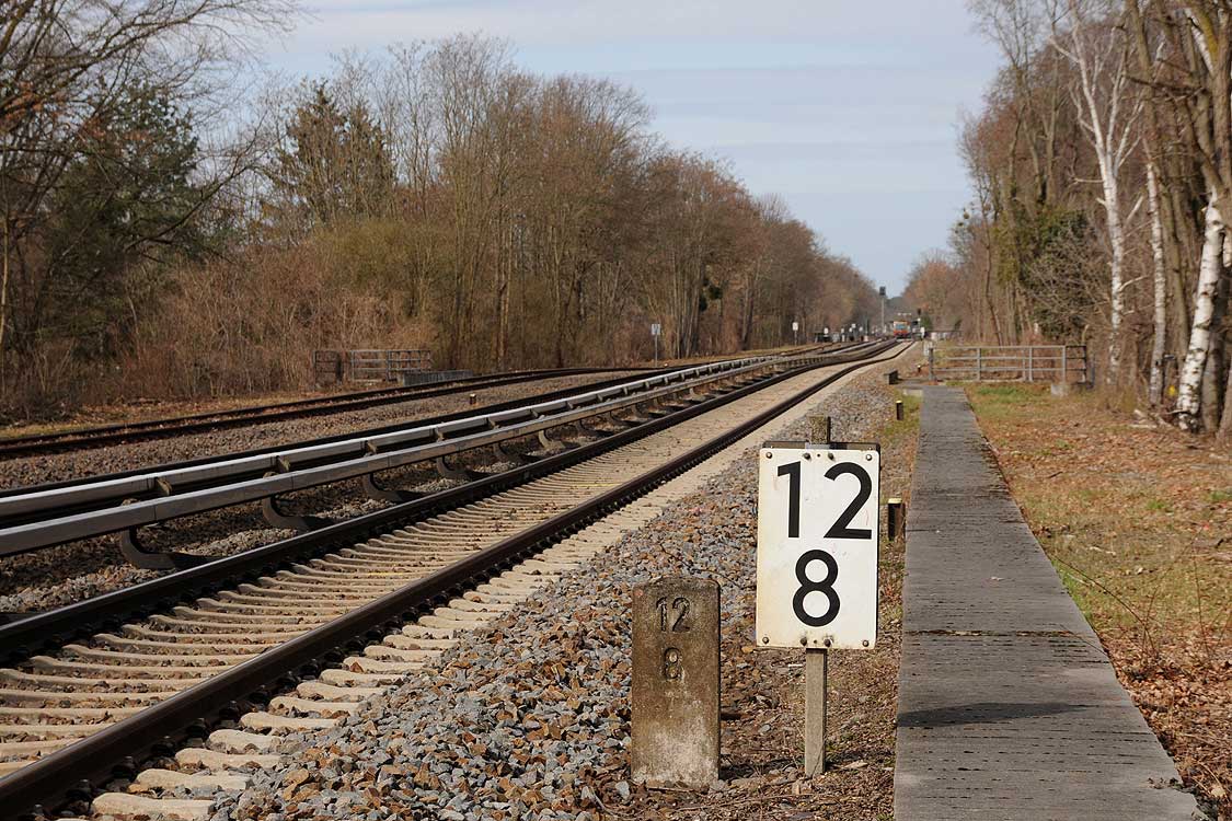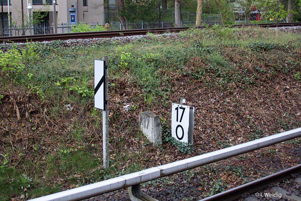 km 17,0 (Tafel) und km 17,1 (Stein) in Nikolassee (Wannseebahn) - Blick Richtung