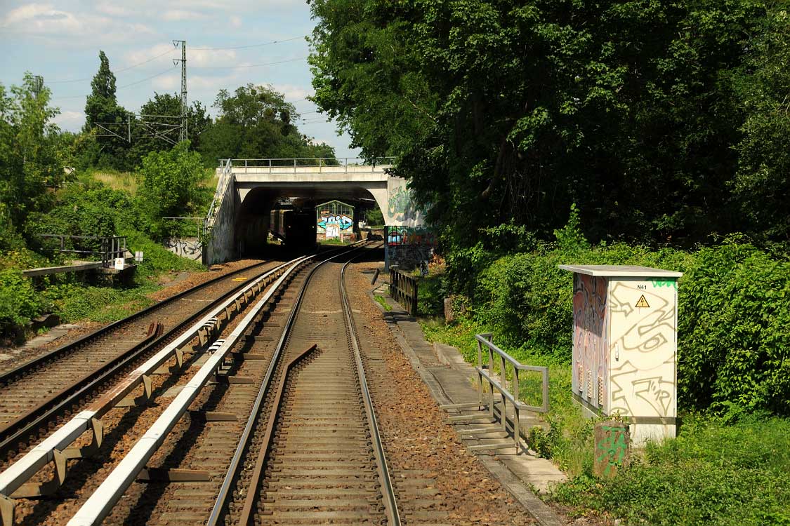 Links unter dem Durchgang ist km 17,0 der Wannseebahn zu