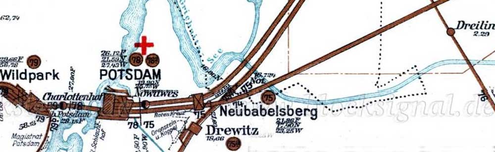 Berlin-Wannsee, W 59; km 18,743 (G-Bahn) Oben die Strecke Berlin-Charlottenburg 0,0 (später: -0,12) -