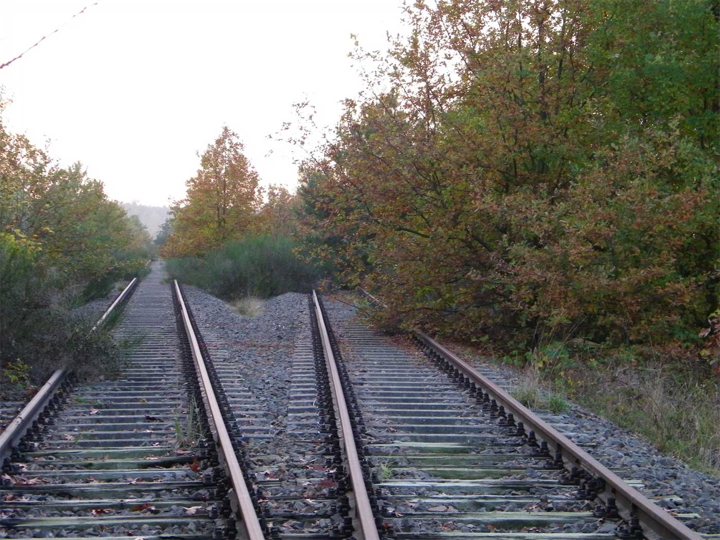 Nach links die Strecke 6848, nach rechts die Strecke 6849, die an der Weichenspitze beginnt.
