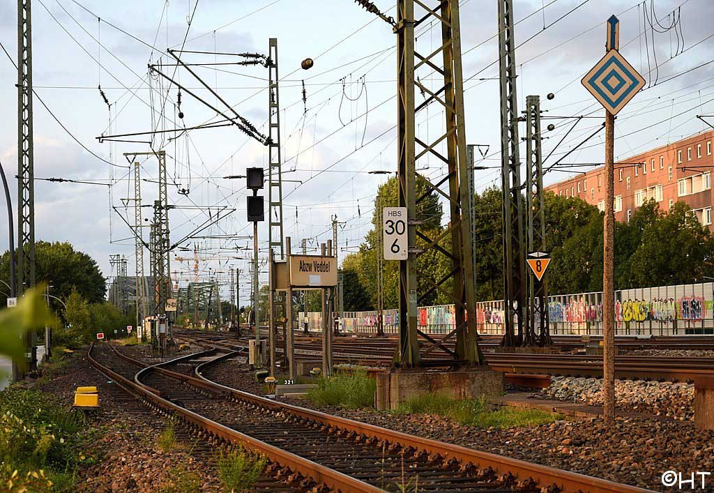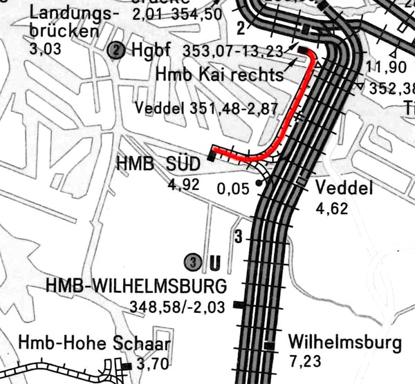 km 30,0 (HBS) [Veddeler Damm, Weiche HBS 004] liegt etwa bei km 207,5 (HBS) der Strecke