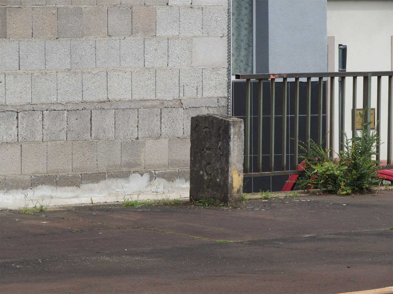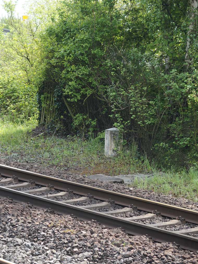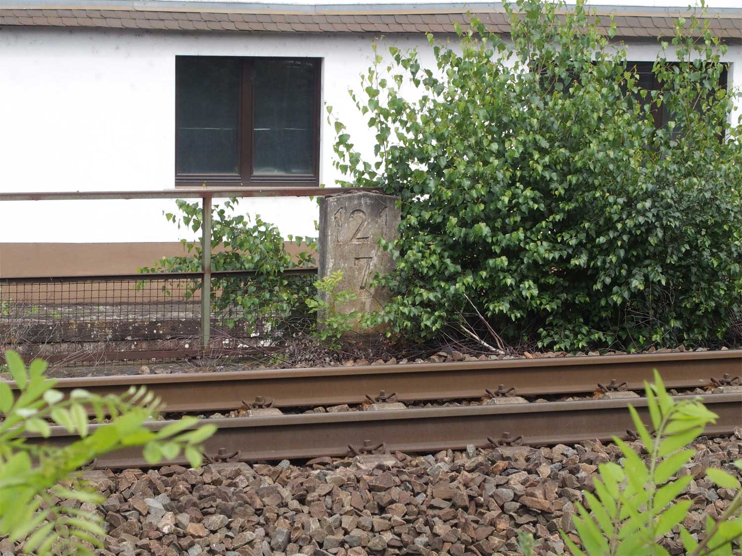 und km 125,6 (Tafel und Stein) und km 125,7 (Stein, links etwas verdeckt) - Blick Richtung Frankfurt (Main)