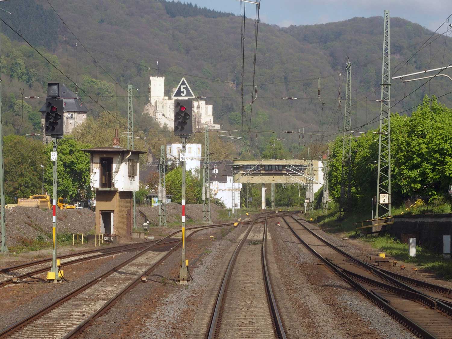 km 121,6 in Oberlahnstein und Brückenstellwerk Of - Blick Richtung Niederlahnstein