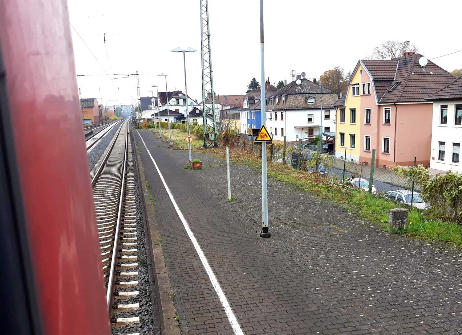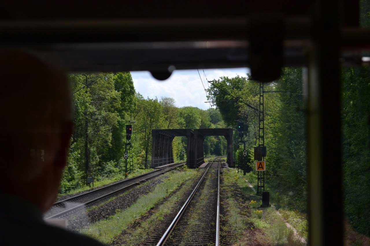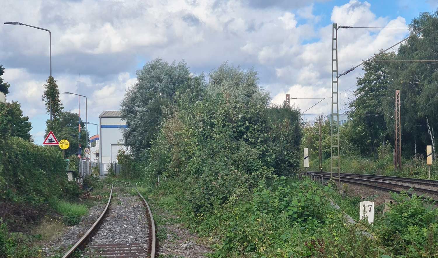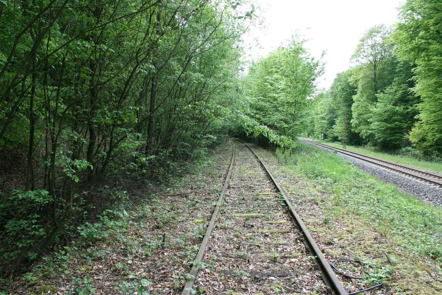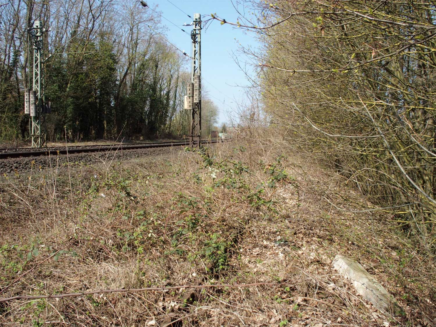 Rechts im Bewuchs das Gleis der Strecke Engers - Au