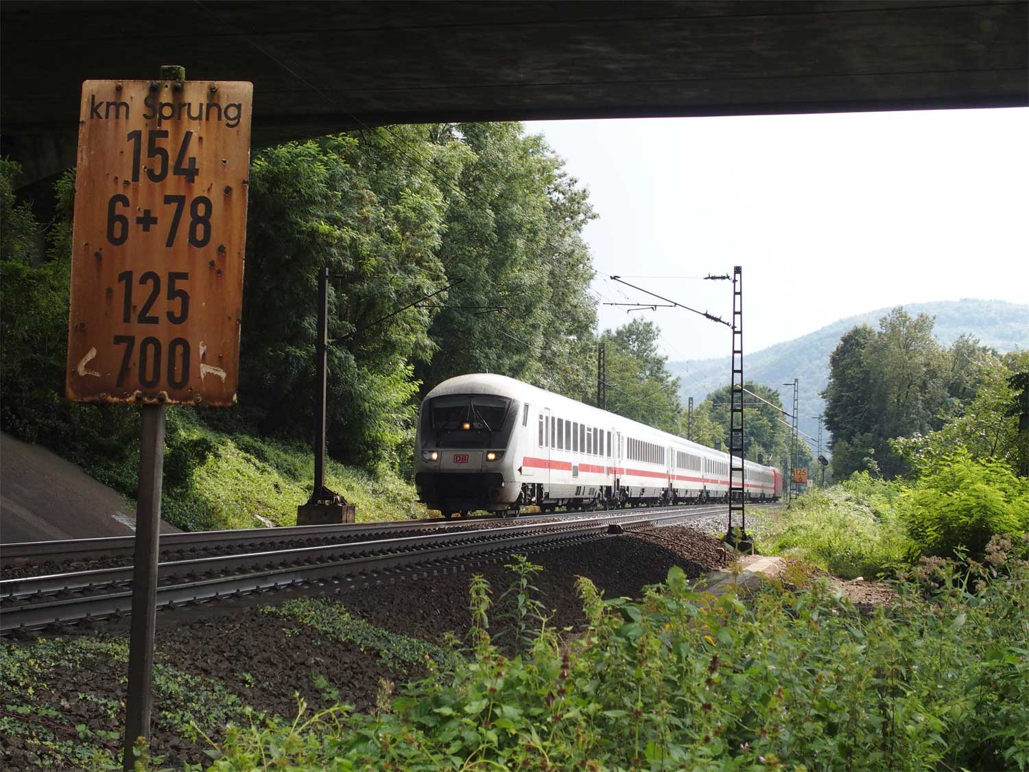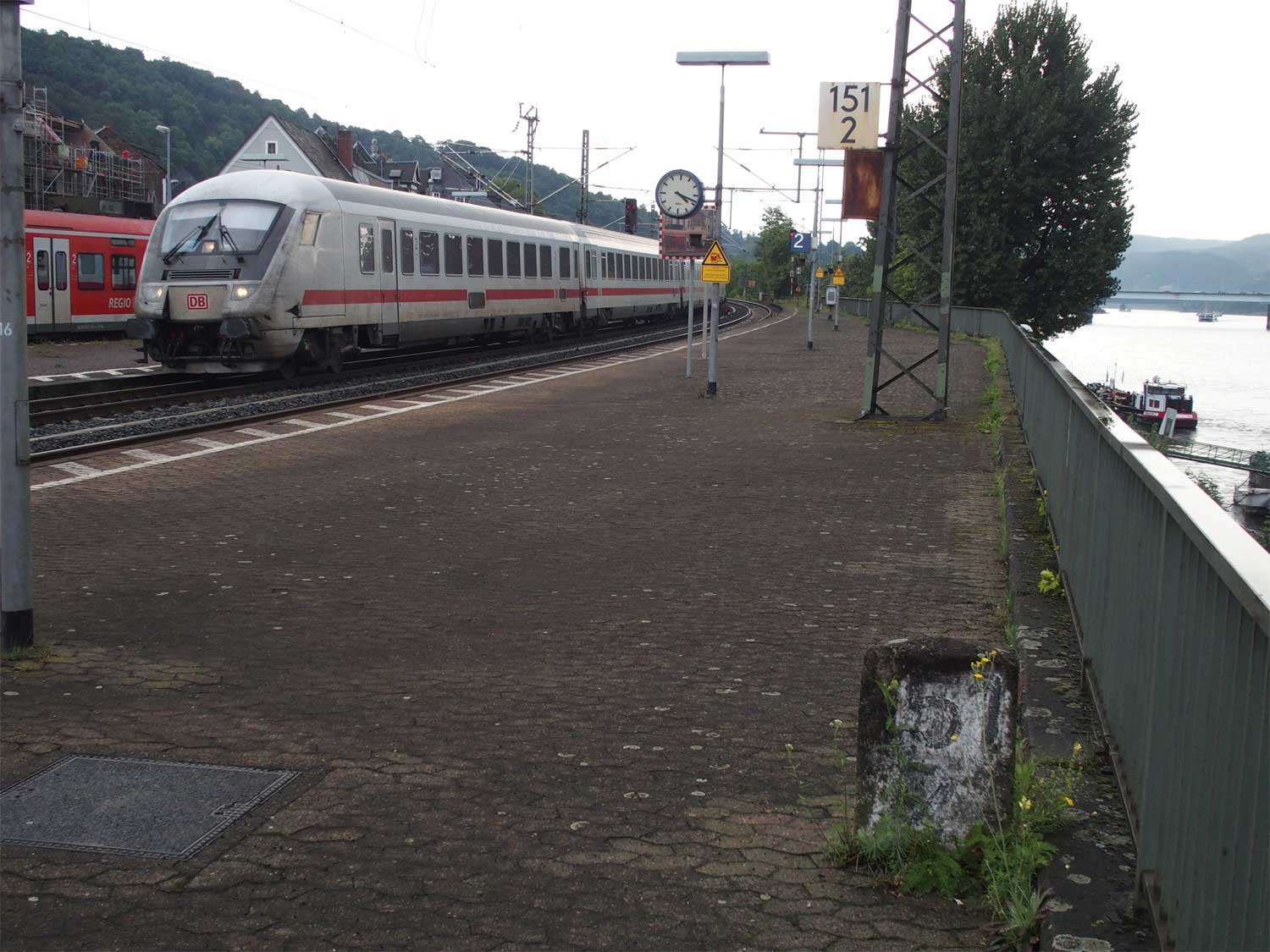 km 151,2 (Tafel und Stein) in Koblenz-Ehrenbreitstein - umgeleiteter IC 2012, geschoben von 101 004
