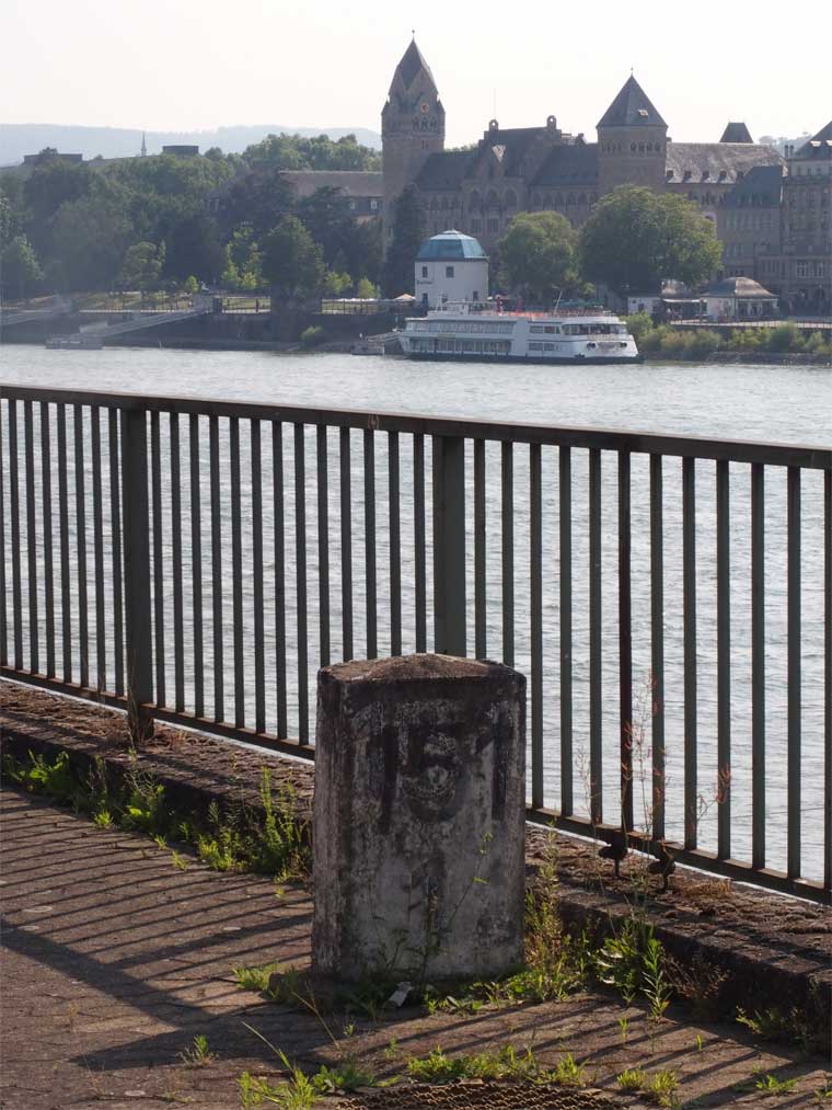 km 150,0 (Tafel) und km 151,1 (Stein) in Koblenz-Ehrenbreitstein - Blick Richtung Köln
