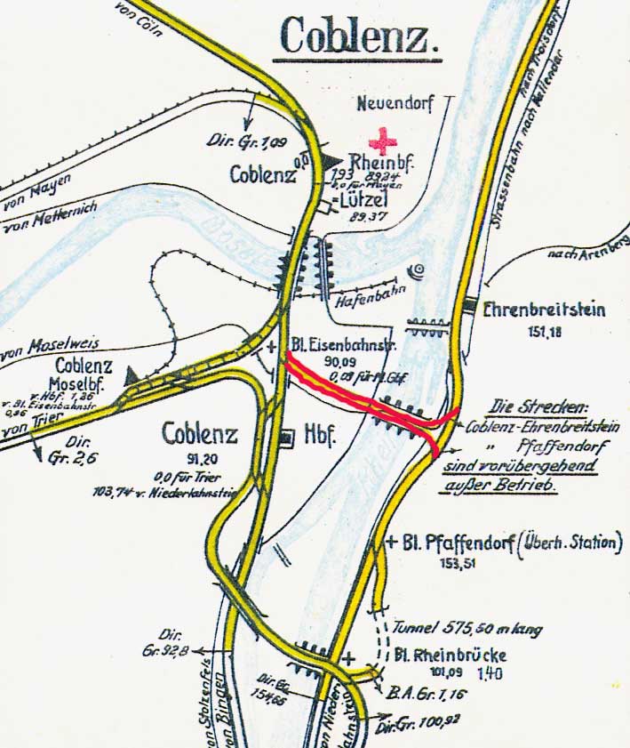 Abzw | Abzw zur ehemaligen Paffendorfer Brücke - Koblenz Rheinbf (bis ca. 1914) | |