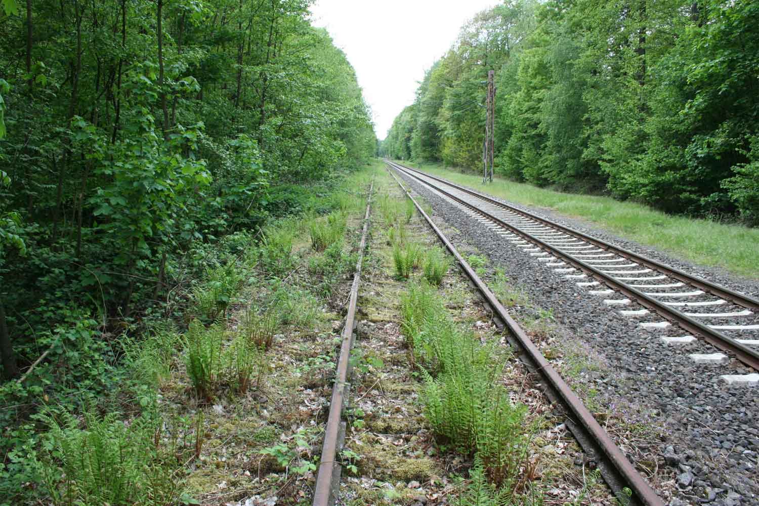Links im Bewuchs das Gleis der Strecke Engers - Au