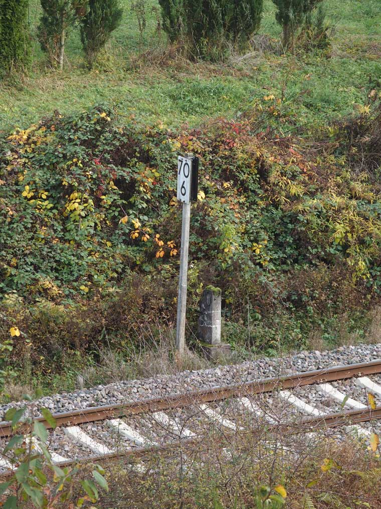 km -0,822 der Strecke Bruchsal -0,822 - Bretten 14,89 - Landesgrenze Baden/Württemberg km 16,029 = (km 62,496 - Mühlacker 46,56 - Bietigheim-Bissingen 23,40 (Abzw. von Strecke 153) (Stuttgart Hbf 0,0) | ||