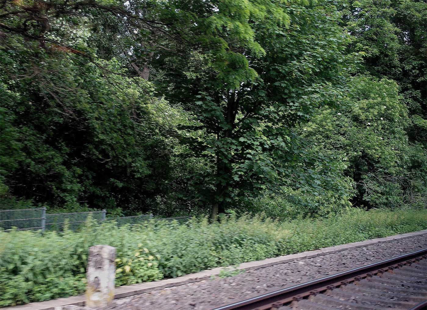 Brücke (Ludendorffbrücke) begann. Trassenreste sind im Bewuchs am rechten