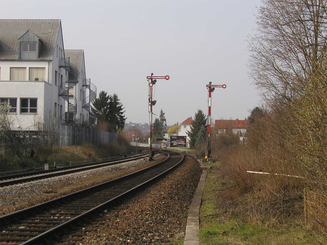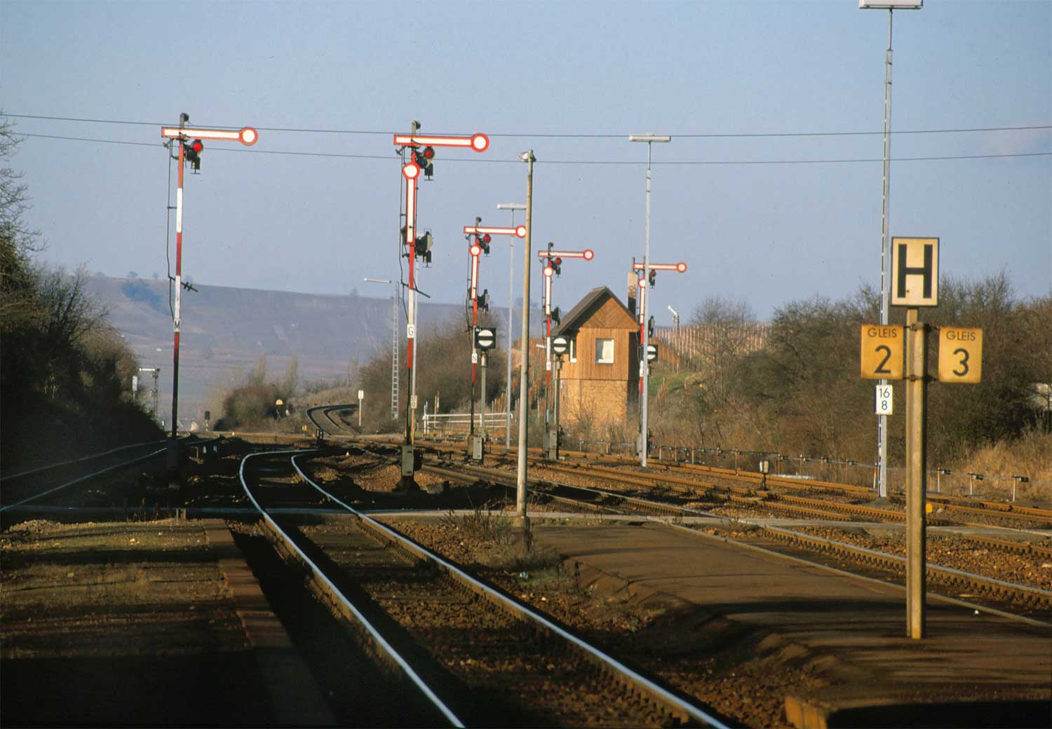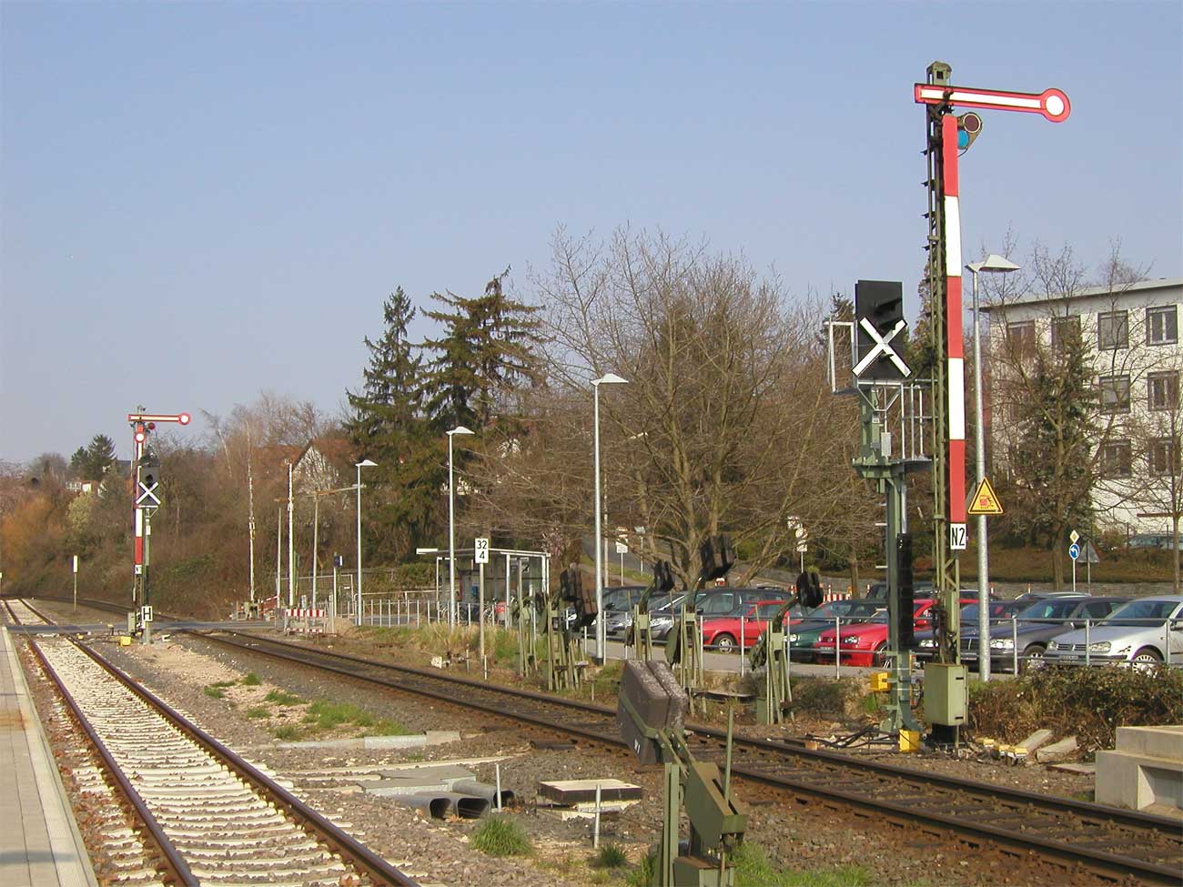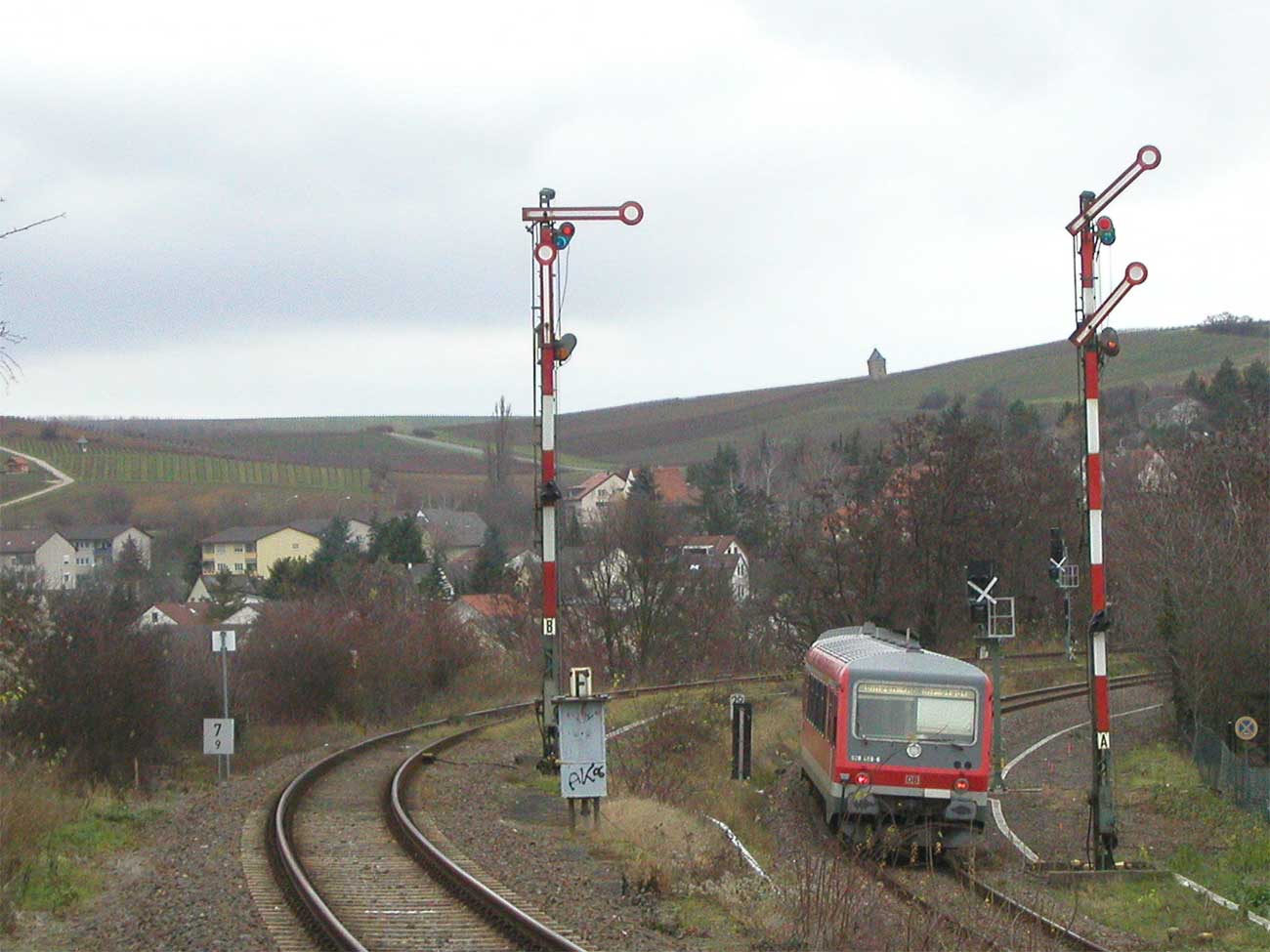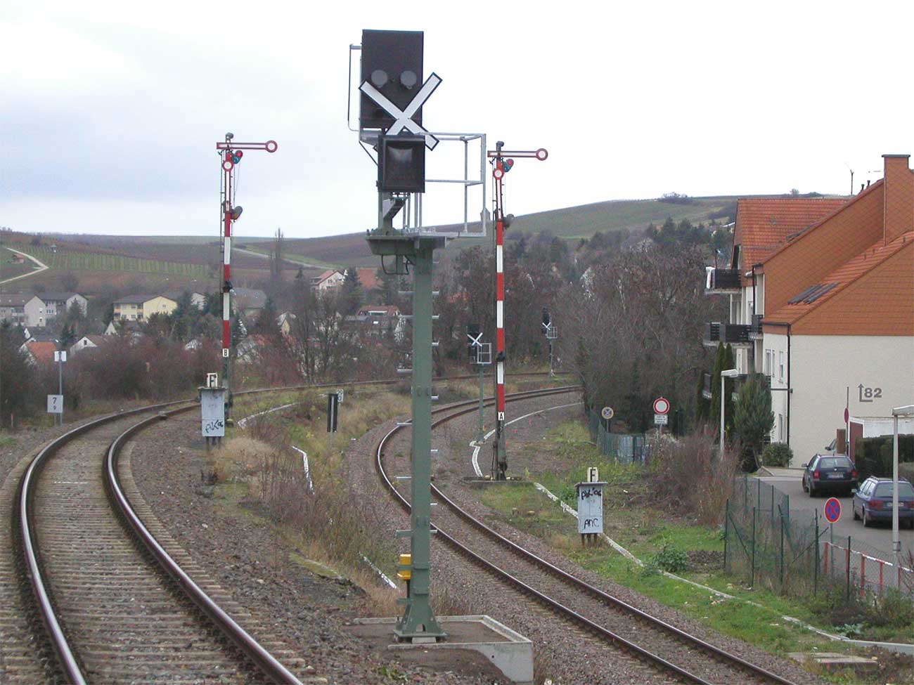 km 49,09 der Strecke [(ehern. preuß.-pfälz. Grenze b. Bexbach 0,0) - Homburg (Saar) 8,37 - Kaiserslautern Hbf 43,70 - Ludwigshafen (Rhein) Hbf 106,535 (kommend)/105,613 (gehend) - Frankenthal 117,26 - Landesgrenze Pfalz/Hessen 125,10] = km 0,0 - Worms 3,21 - Mainz Hbf 49,09 | ||