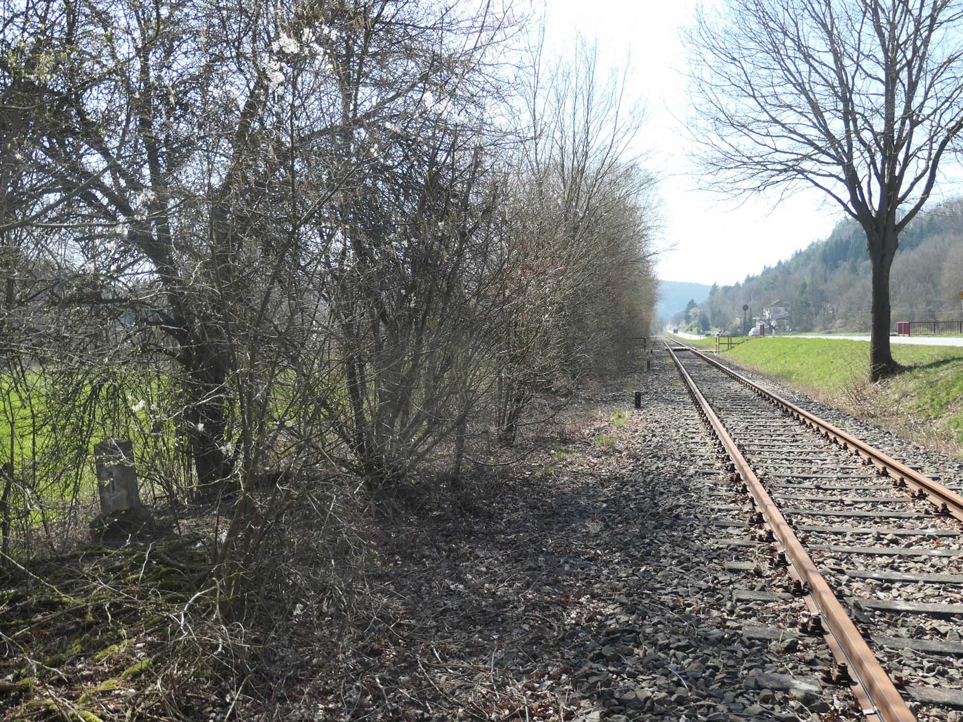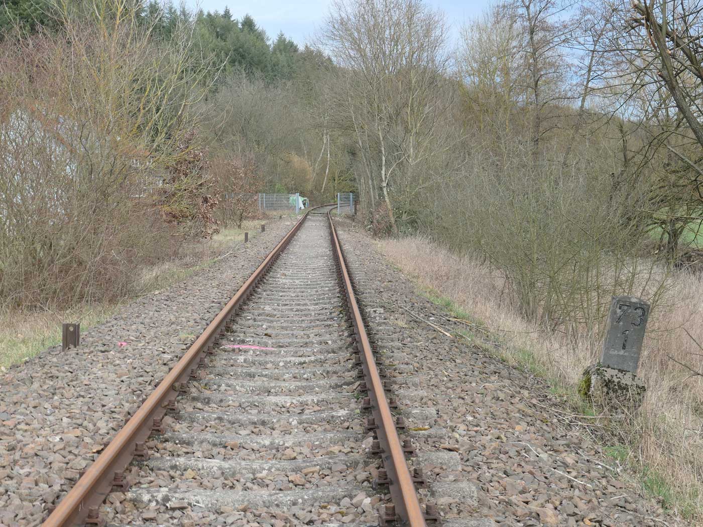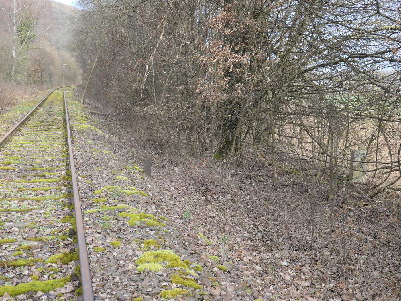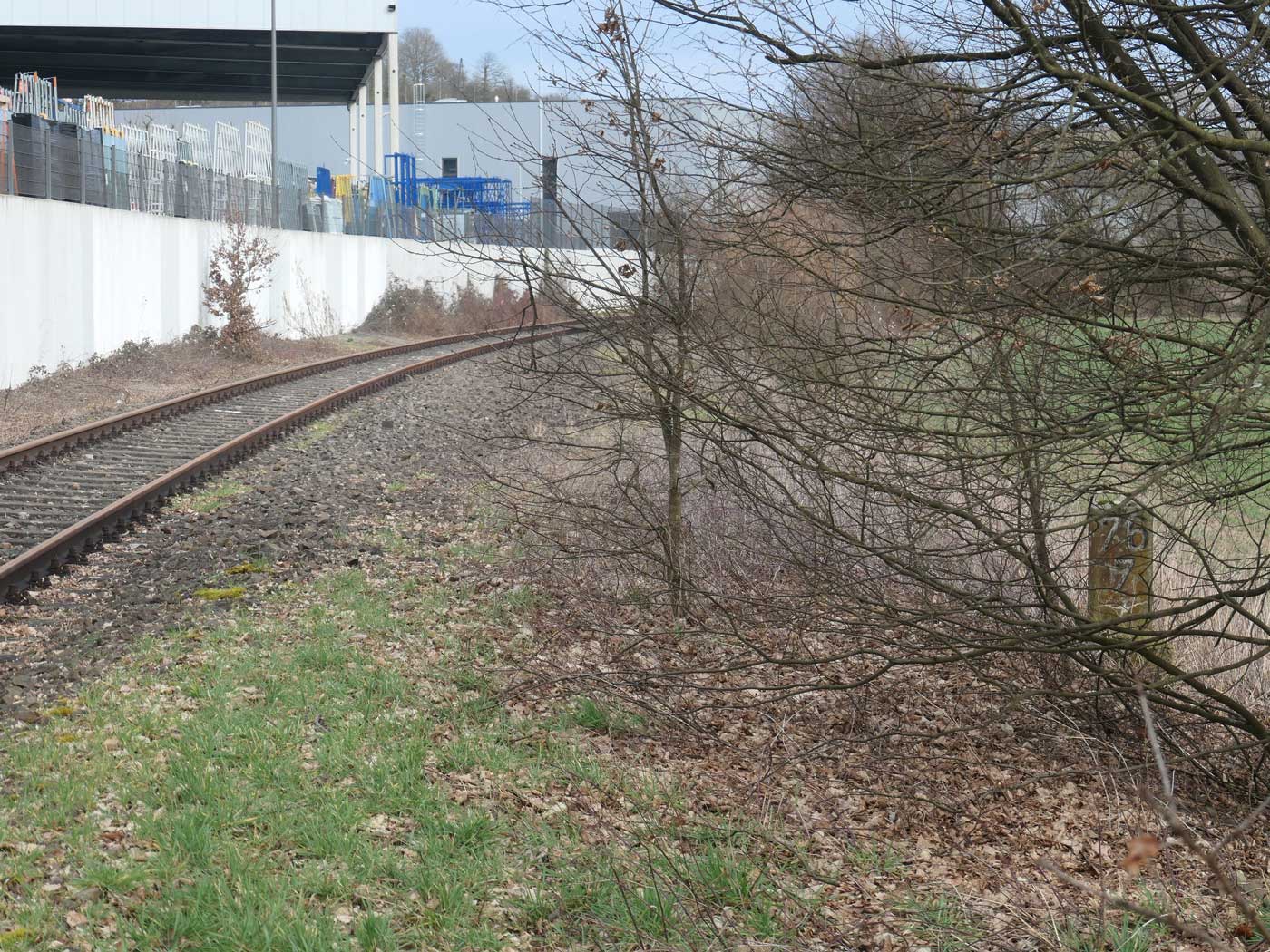 Rechts zwischen Gsp und Lampenmast am Zaun befindet sich km 34,4 der Strecke