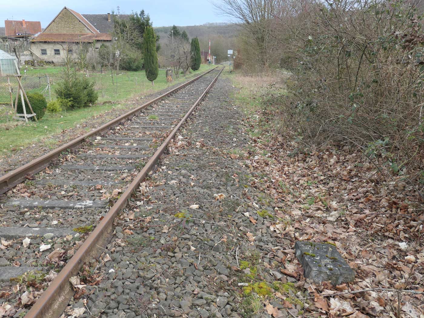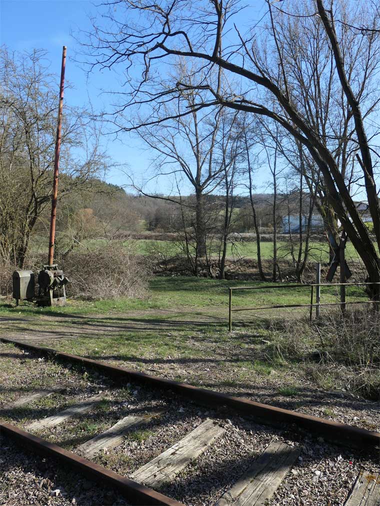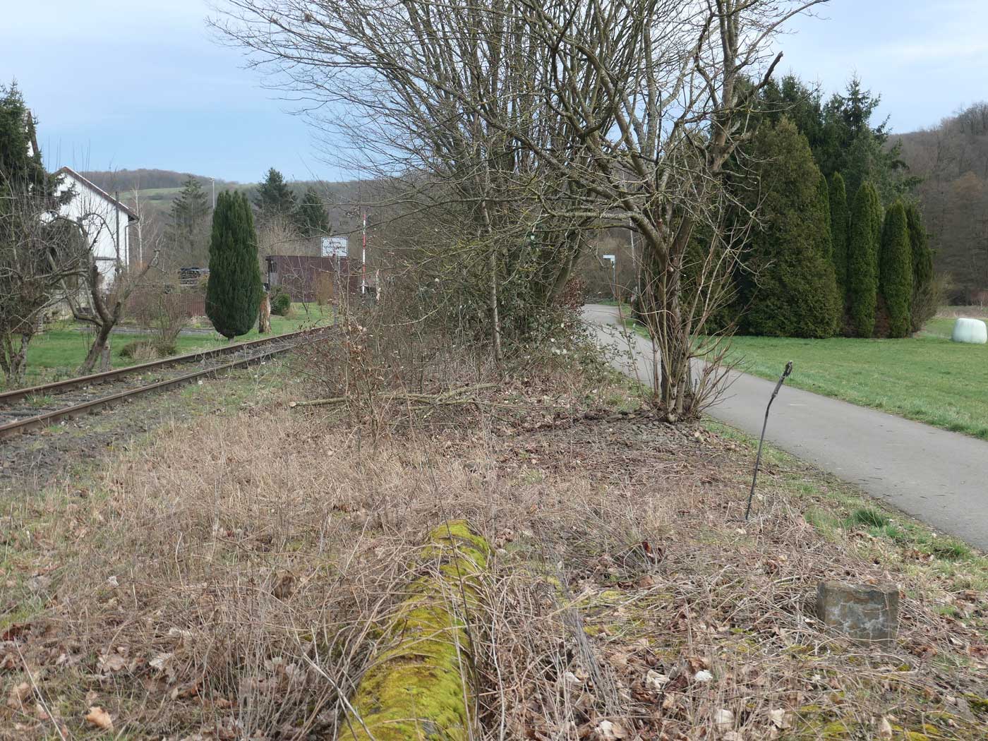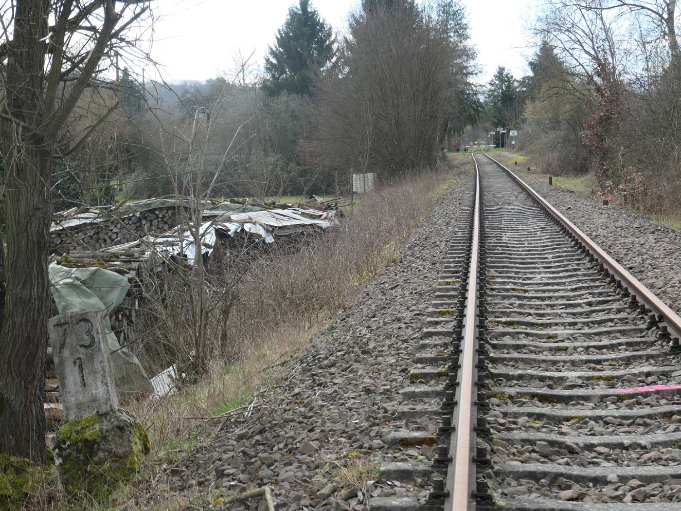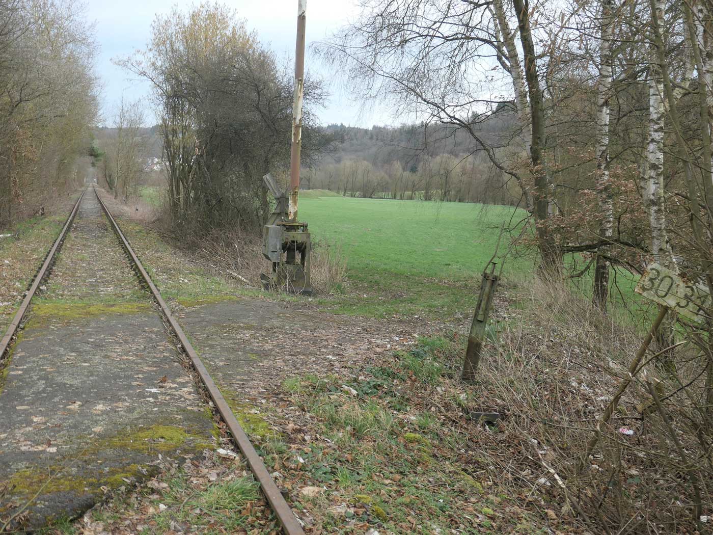 Rechts zwischen Gsp und Lampenmast am Zaun befindet sich km 34,4 der Strecke