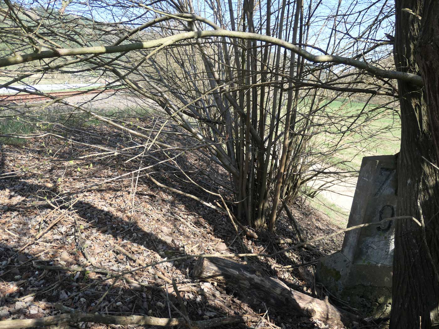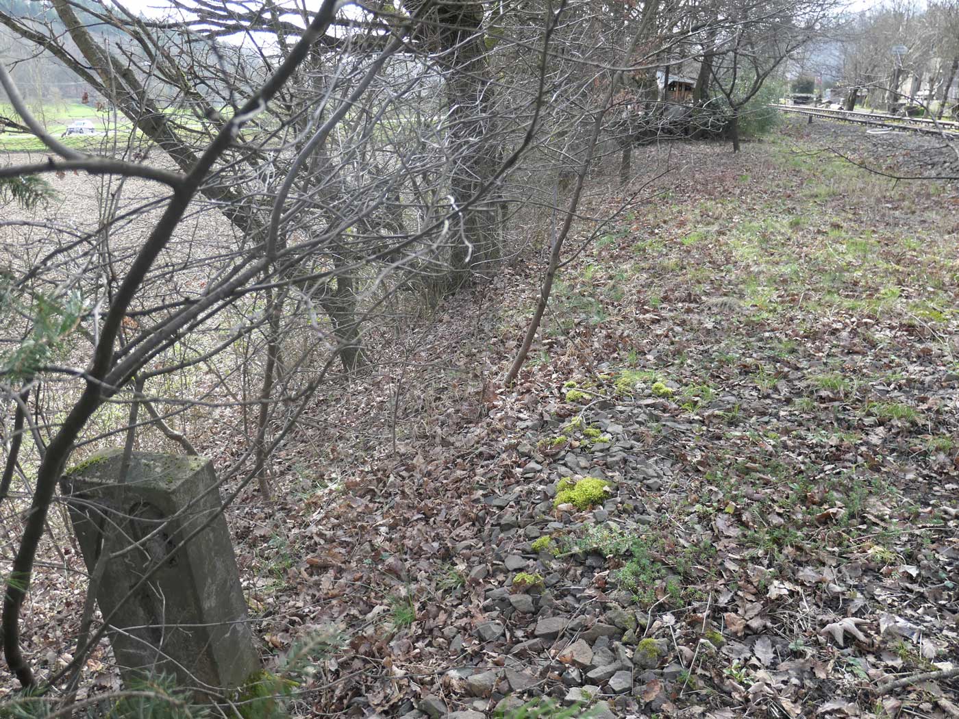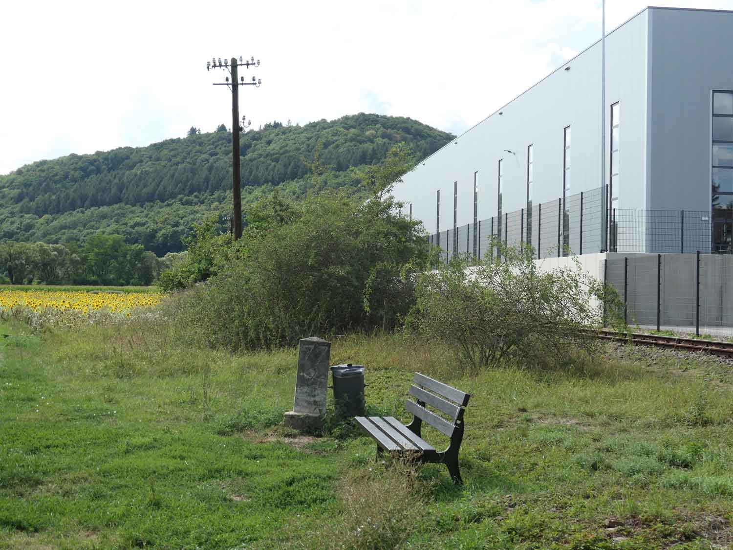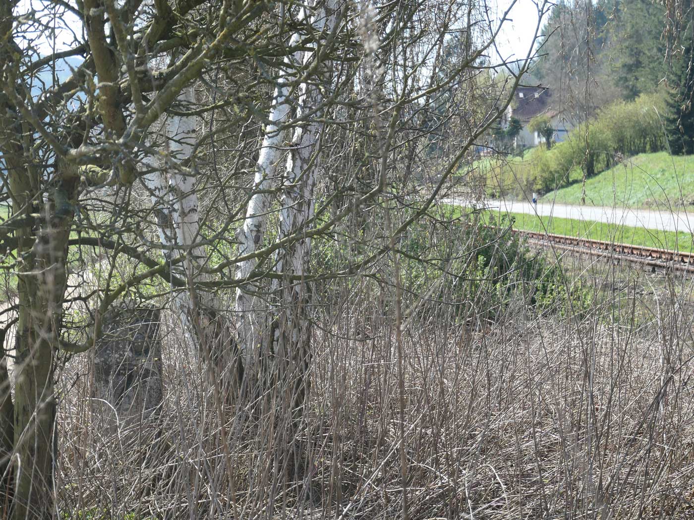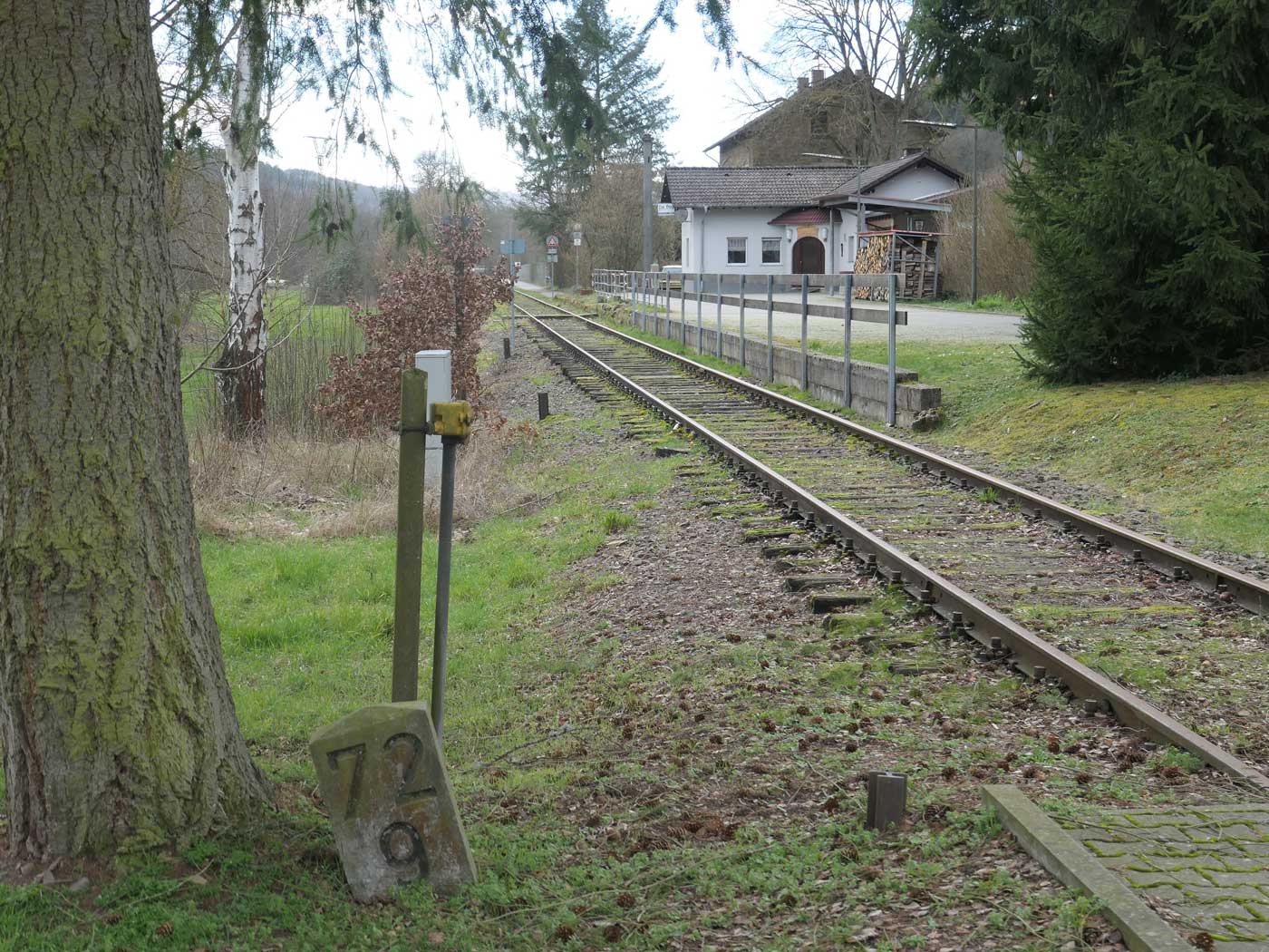 Rechts zwischen Gsp und Lampenmast am Zaun befindet sich km 34,4 der Strecke