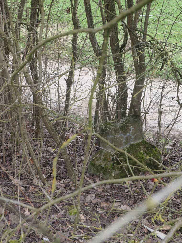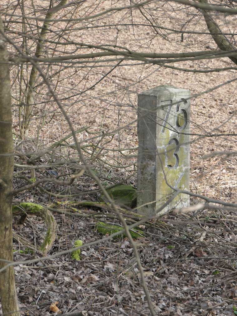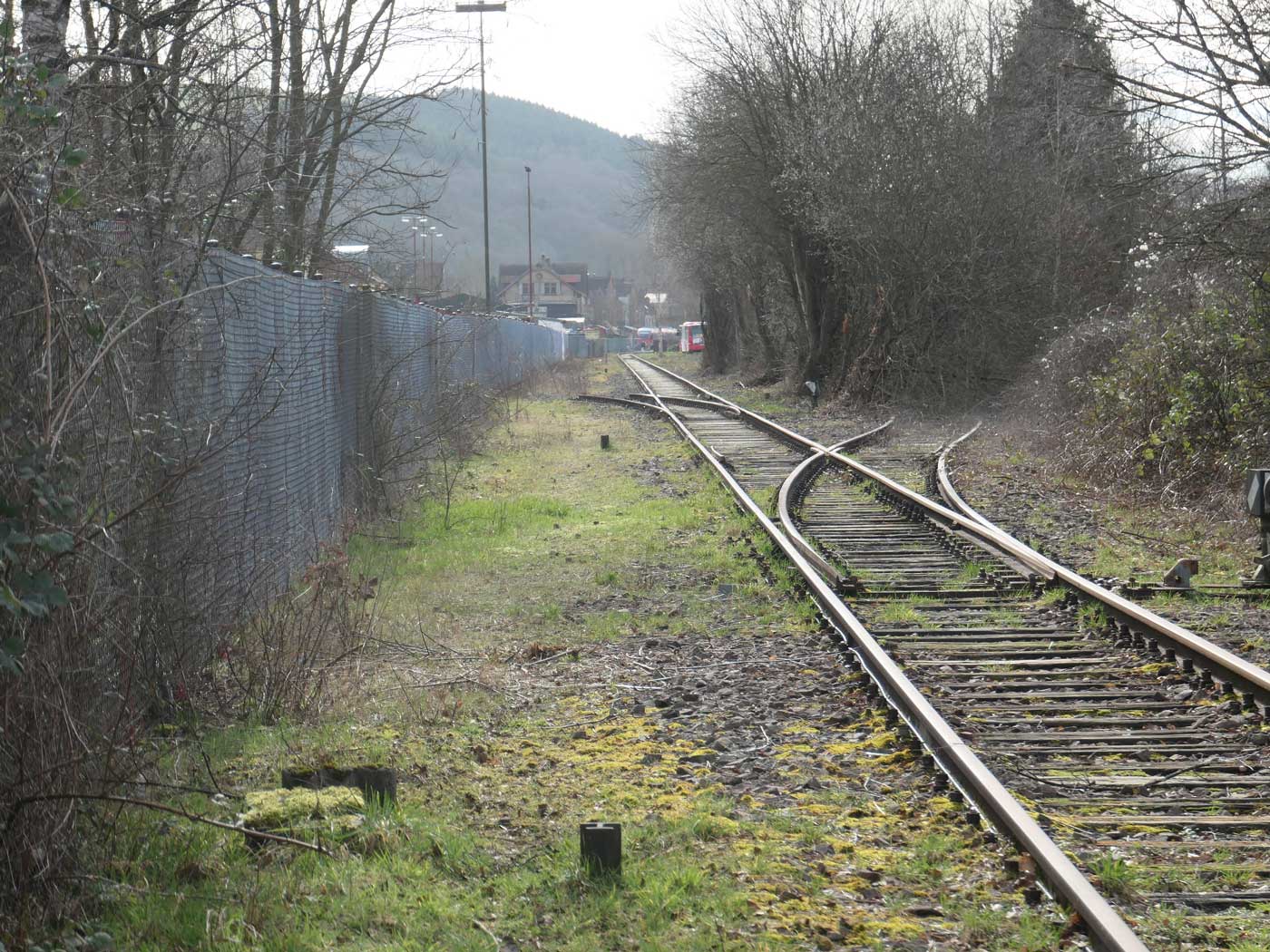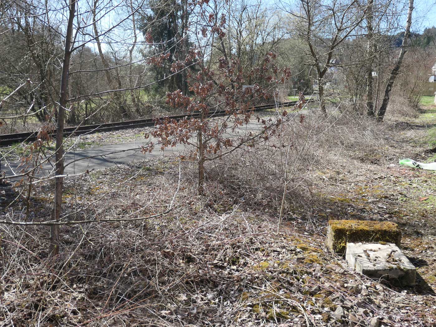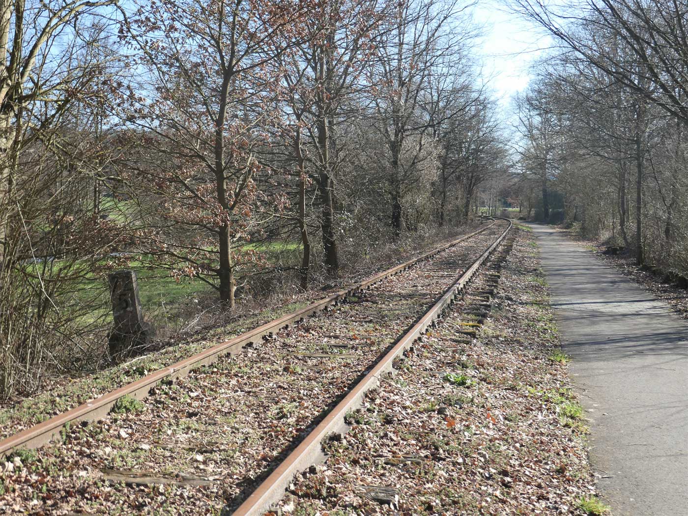 Rechts zwischen Gsp und Lampenmast am Zaun befindet sich km 34,4 der Strecke