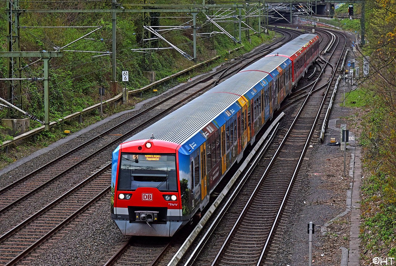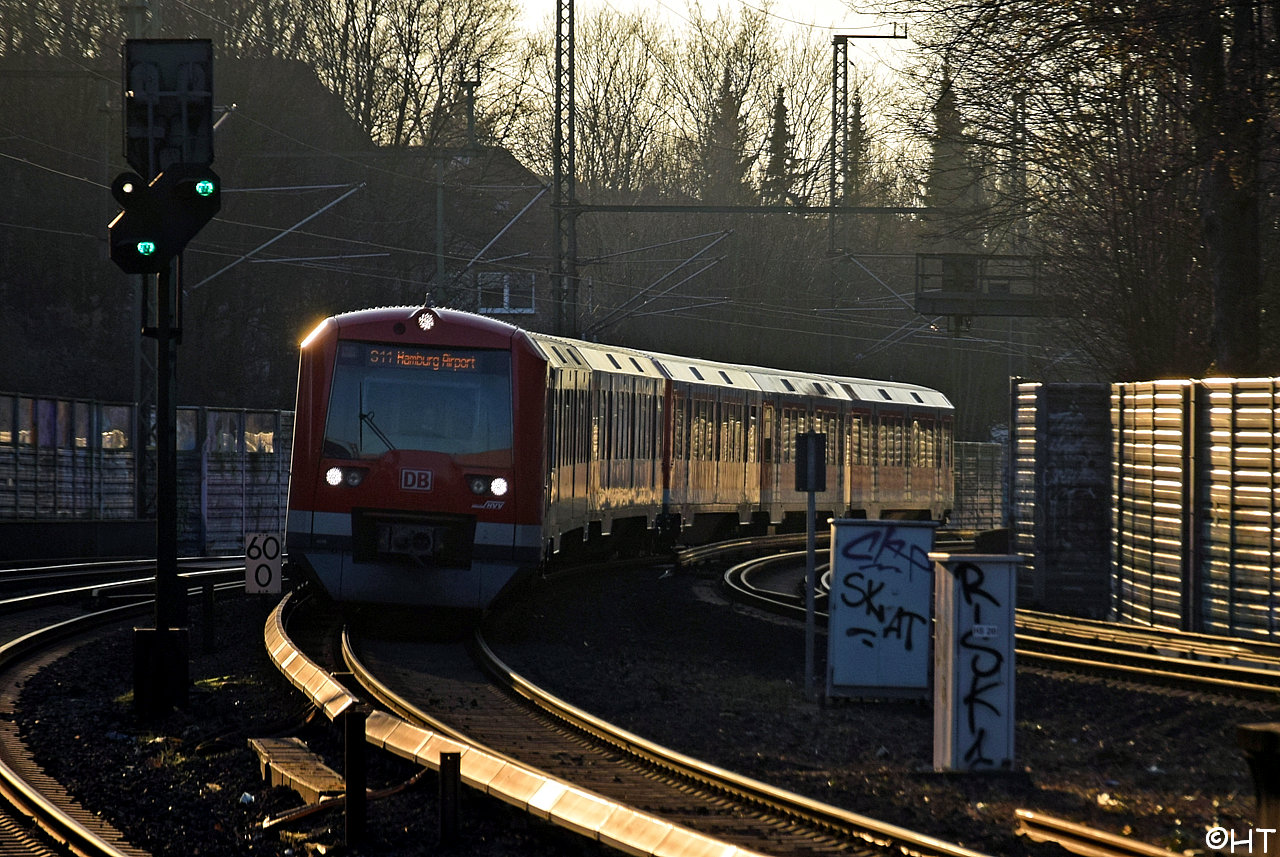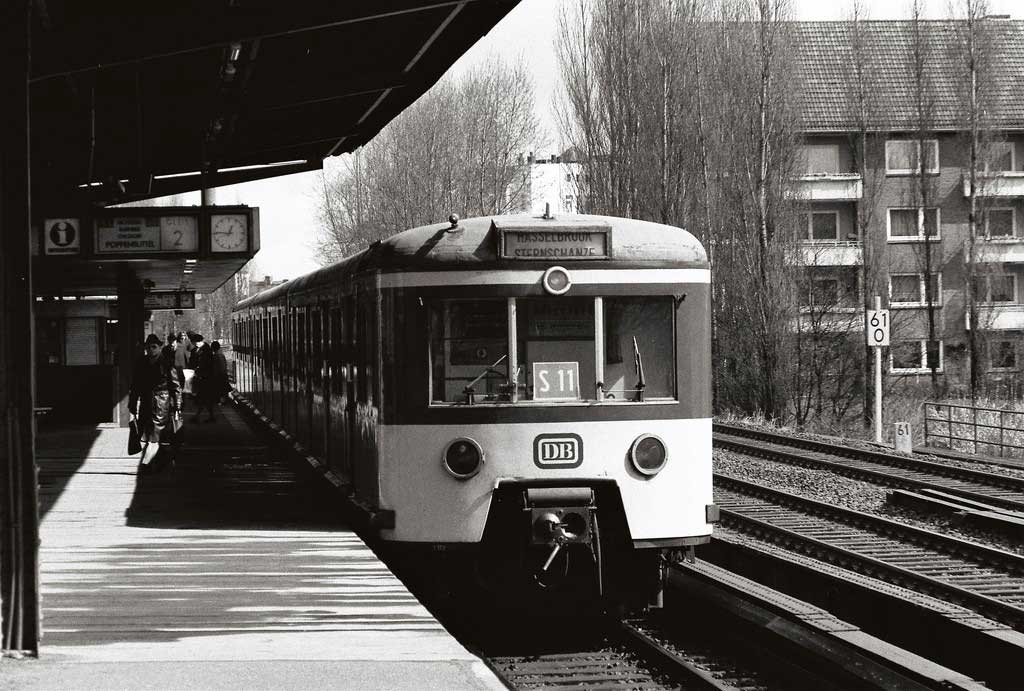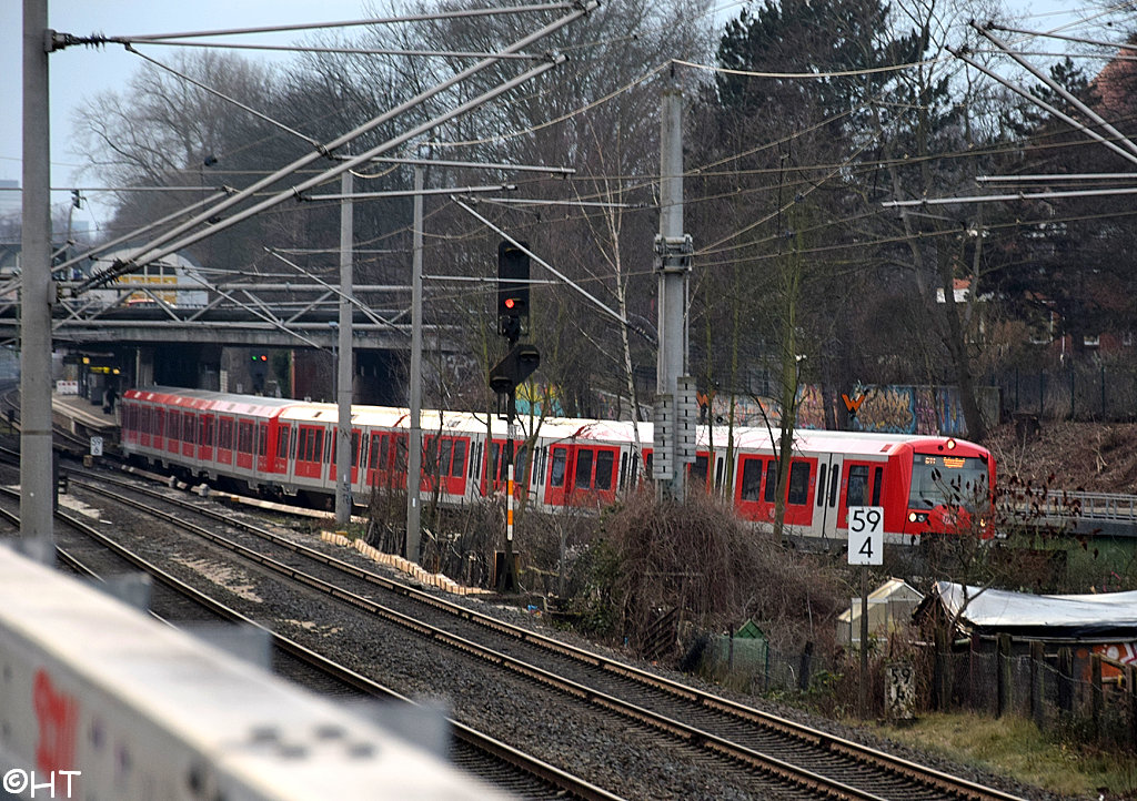Links zwei S-Bahnzüge der S 11, das höherliegende Gleis gehört zu Hamburger Hochbahn