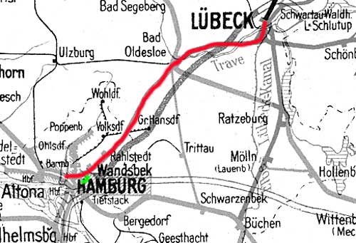 Lübeck Hbf 0,0 - km 4,747 = km 5,800 (Fehllänge 1053 m) - Bad Oldesloe 23,89 - Hamburg-Wandsbek 58,20 - Hamburg Hbf 63,90