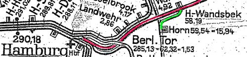 ► | km 58,20 der abzweigenden Strecke (Lübeck Hbf 0,0) - Hamburg-Wandsbek 58,20 - Horn 59,50 mit weiterlaufender Kilometrierung (Streckenverzweigung mit gemeinsamen Nullpunkt Lübeck Hbf) | |