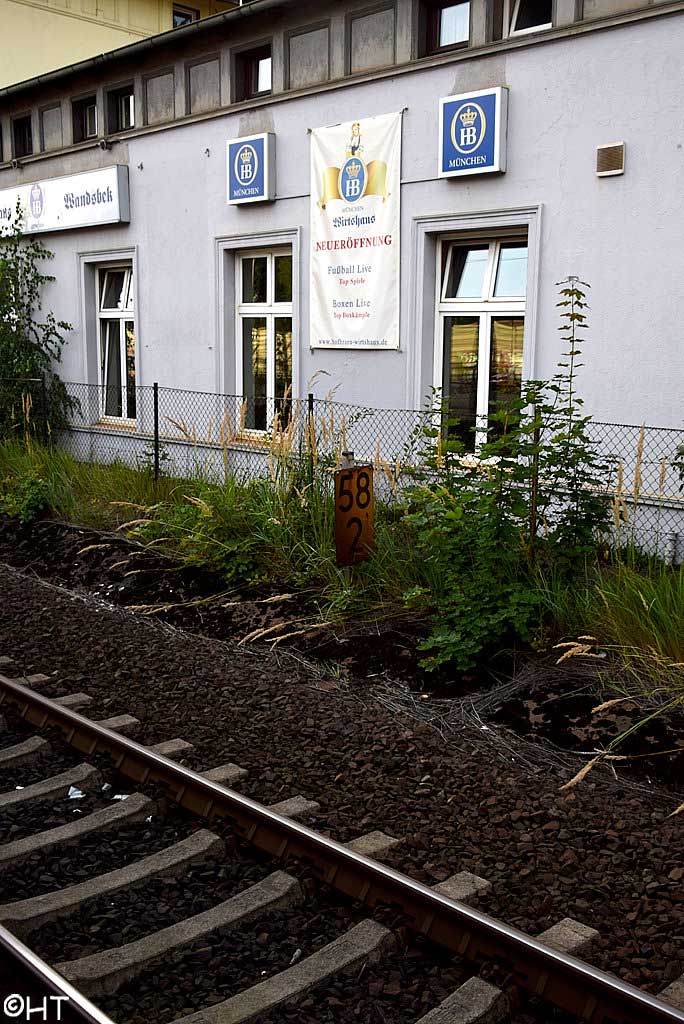 ► | km 58,20 der Strecke Lübeck Hbf 0,0 - km 4,747 = km 5,800 (Fehllänge 1053 m) - Bad Oldesloe 23,89 - Hamburg-Wandsbek 58,20 - Hamburg Hbf 63,90 | |