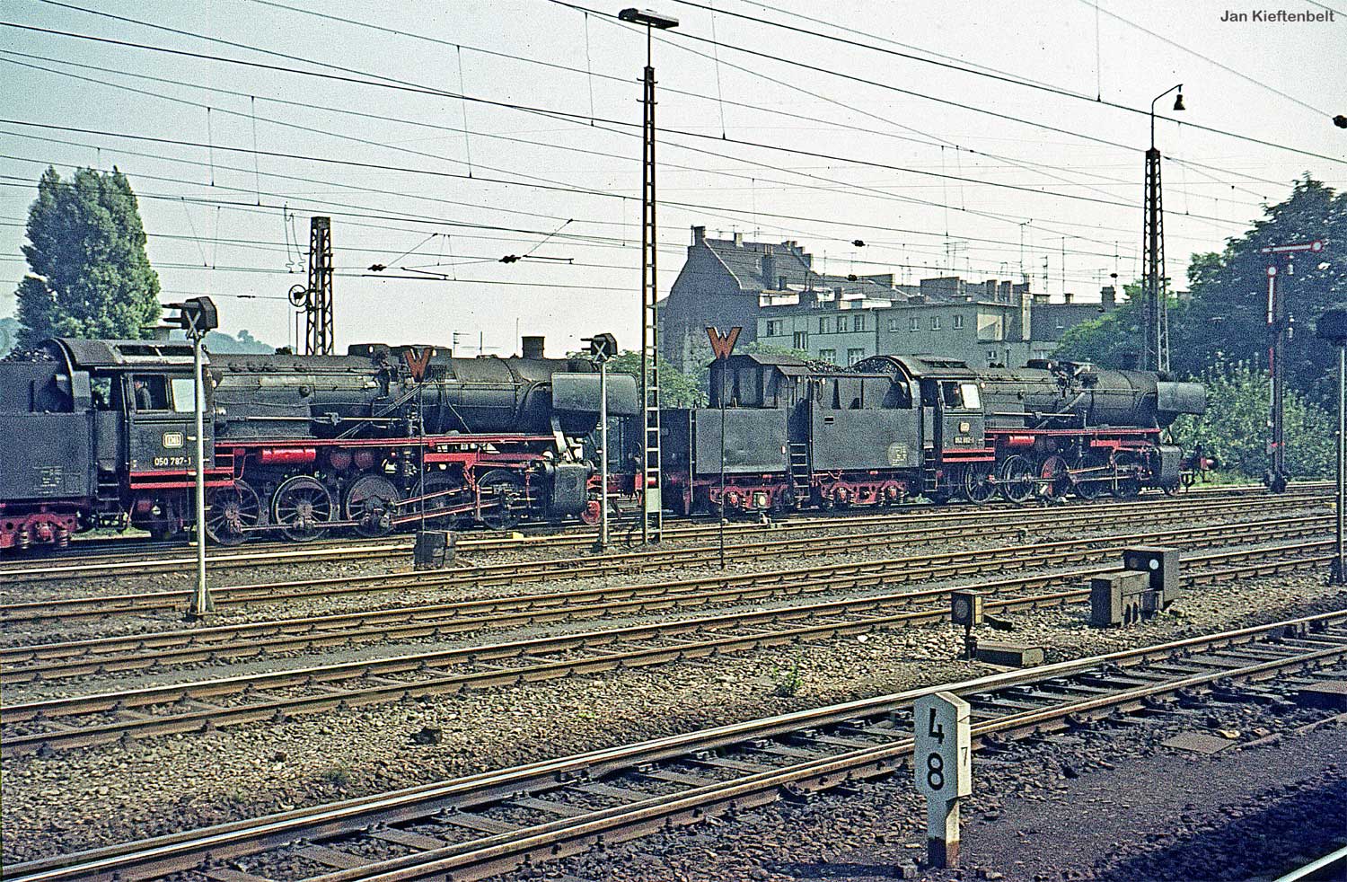 Während der leeren Kokszug noch im Bahnhof Herzogenrath einfährt, ist DB-Lok 140 259 schon wieder mit einem neuen vollen Kohlenzug auf Achse in Richtung Aachen (auf der Steigung nach Kohlscheid). Der Zug wird von der DB-Lok 140 645 nachgeschoben,